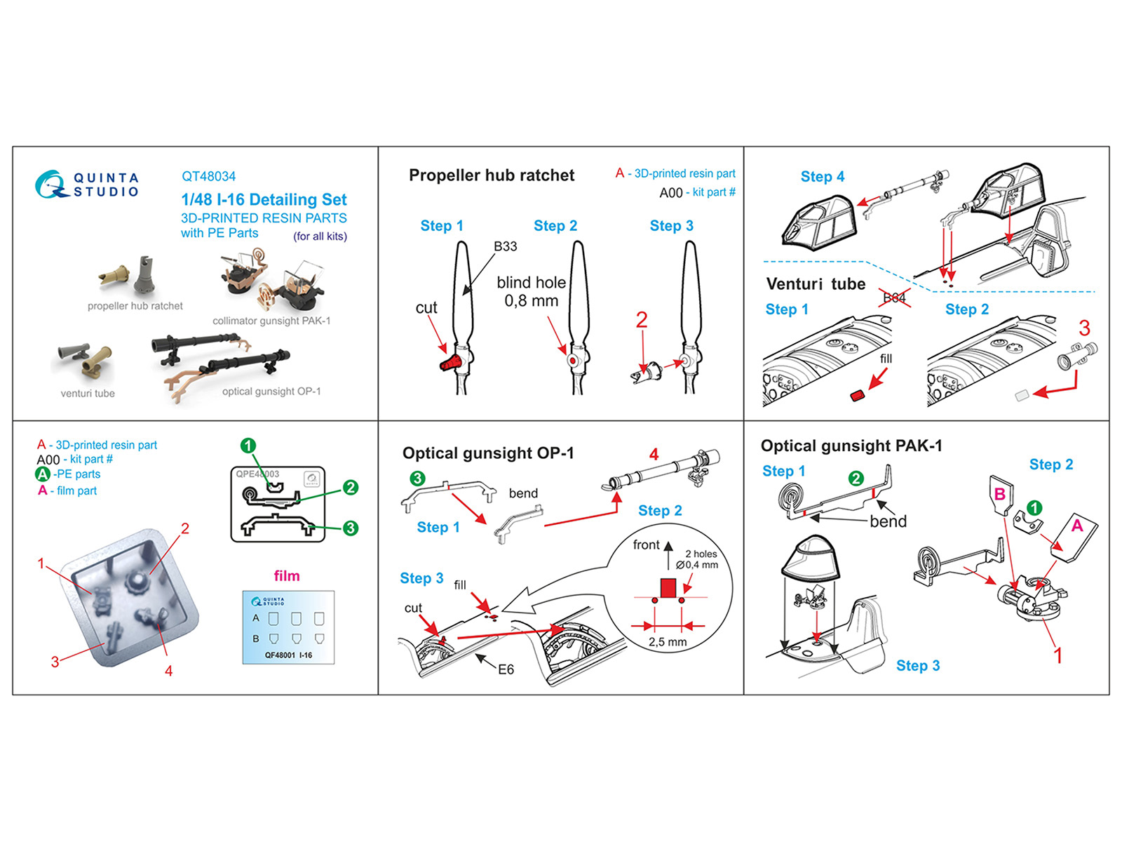 Quinta Studio - 1/48 Polikarpov I-16 Detail set: Propeller hub ratchet, Venturi tube, PAK-1 gunsight, OP-1 gunsight (for Zvezda kits)