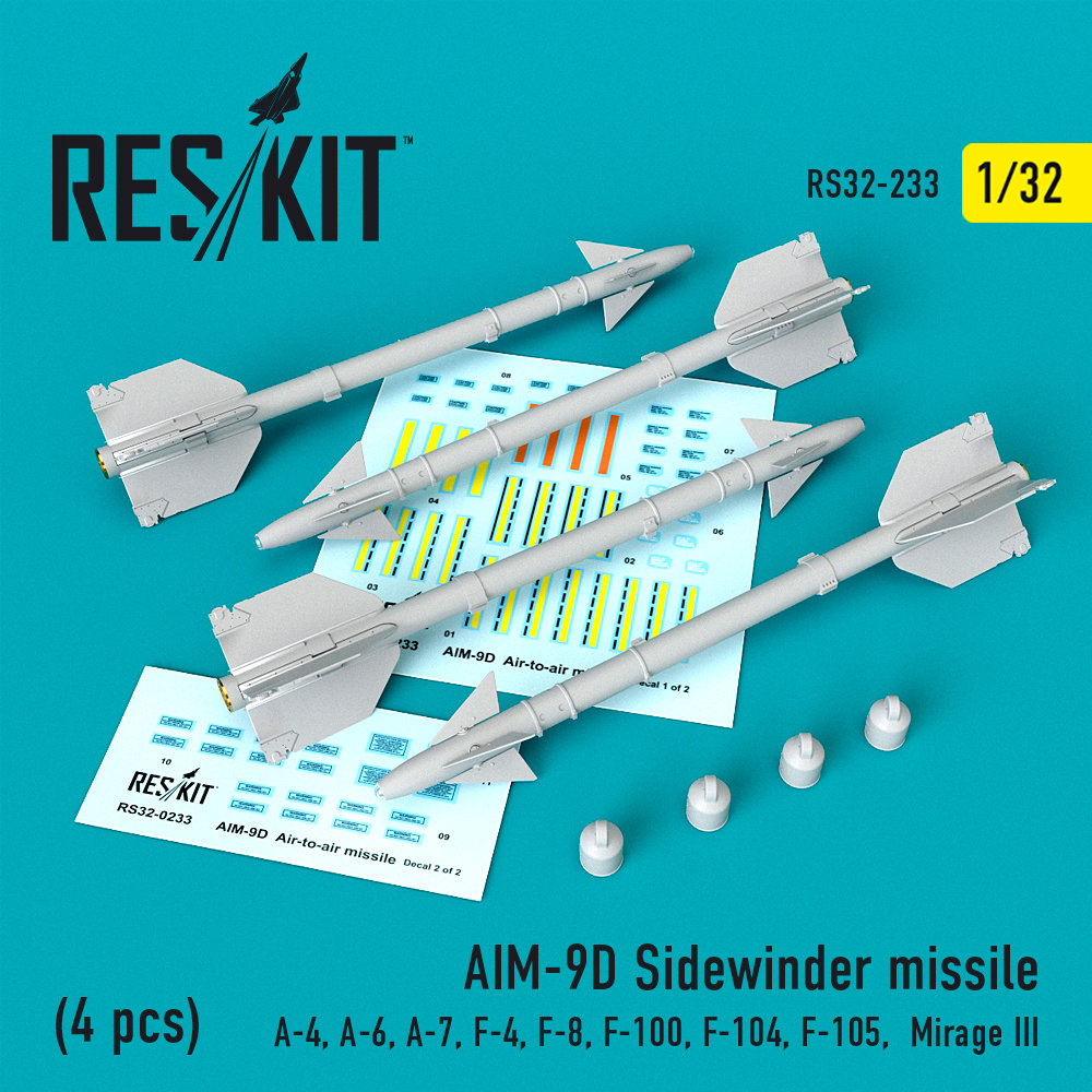 ResKit - 1/32 AIM-9D Sidewinder missile (4 pcs) A-4, Grumman A-6, Vought A-7, McDonnell F-4, F-8, North-American F-100, Lockheed F-104, Republic F-105, Dassault Mirage III(for Academy, Hasegawa, Italeri, Kitty Hawk Model, Revell, Trumpeter and Tamiya kits)