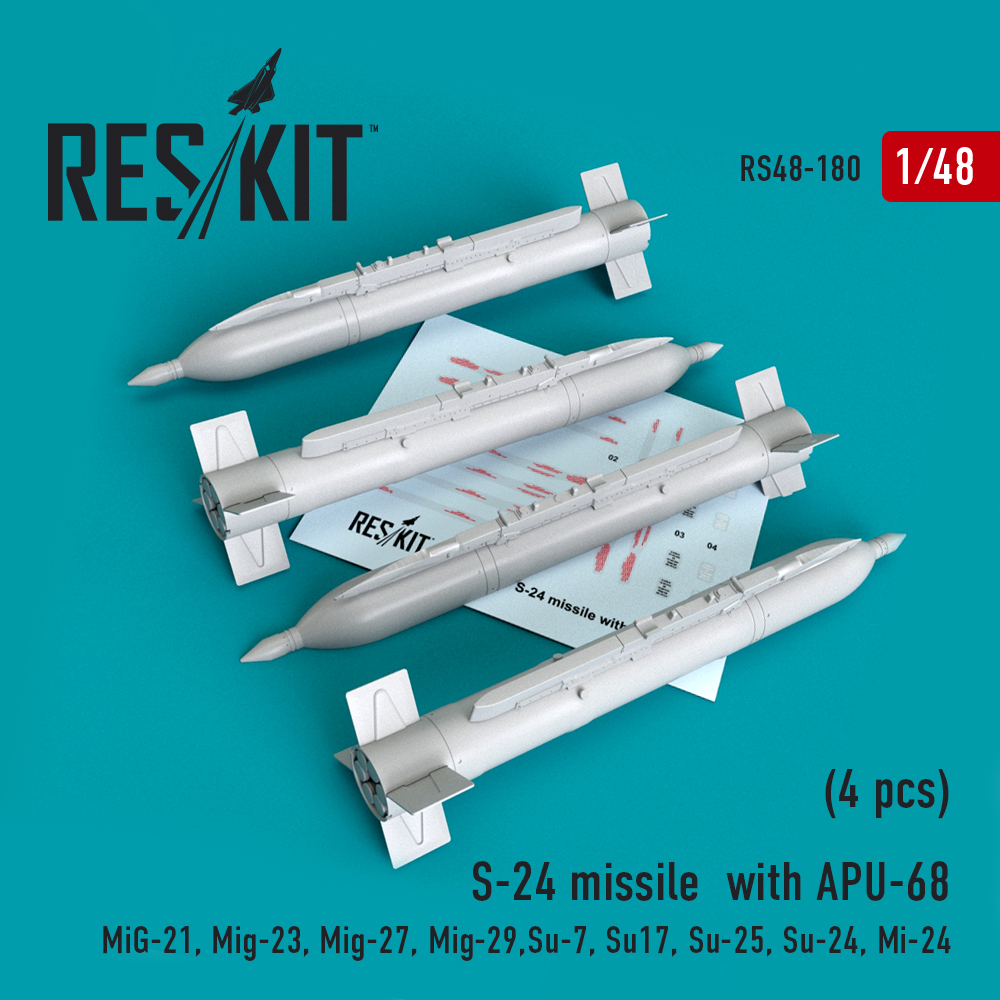 ResKit - 1/48 S-24 missile with APU-68 (4 pcs) Mikoyan MiG-21, Mikoyan MiG-23, Mikoyan MiG-27, Mikoyan MiG-29, Sukhoi Su-7, Su-17, Sukhoi Su-25, Sukhoi Su-24, Mi-24 (for Kopro (ex-KP), Zvezda, Hobby Boss, Kinetic Model, Smer and Trumpeter kits),