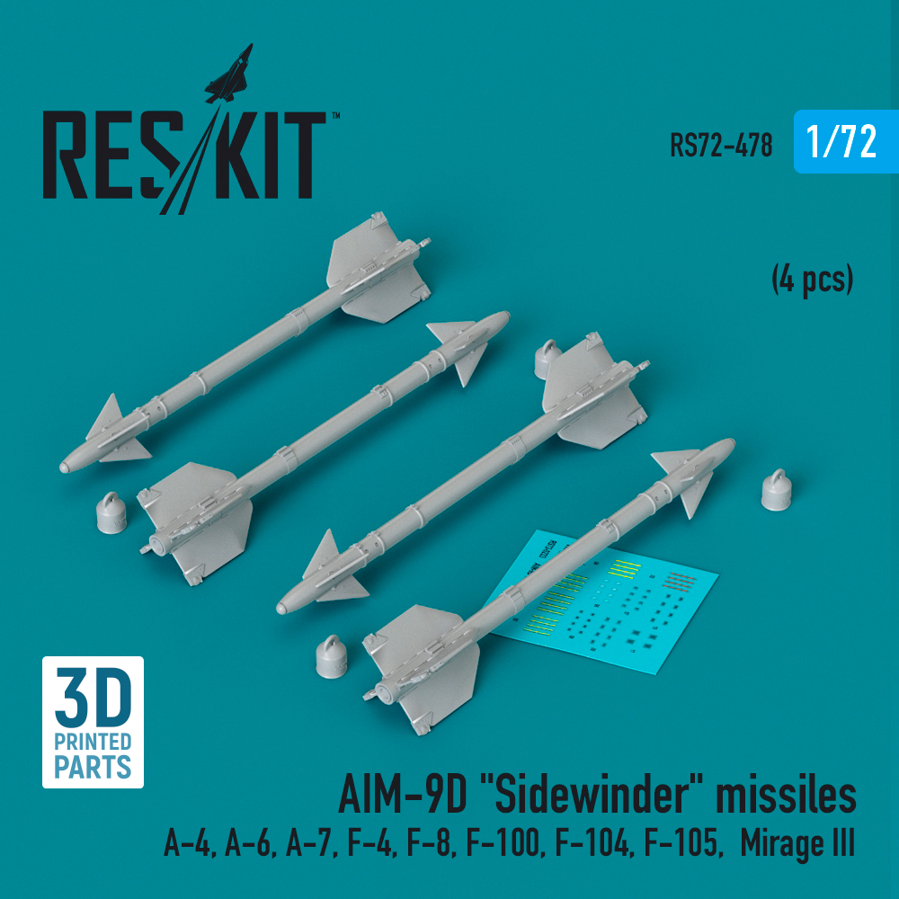 ResKit - 1/72 AIM-9D Sidewinder missiles (4 pcs) (Douglas A-4, A-6, Ltv A-7, McDonnell F-4, F-8, North-American F-100, Lockheed F-104 Starfighter, Republic F-105D/F-105G Thunderchief, Dassault-Mirage III) (3D-Printed)