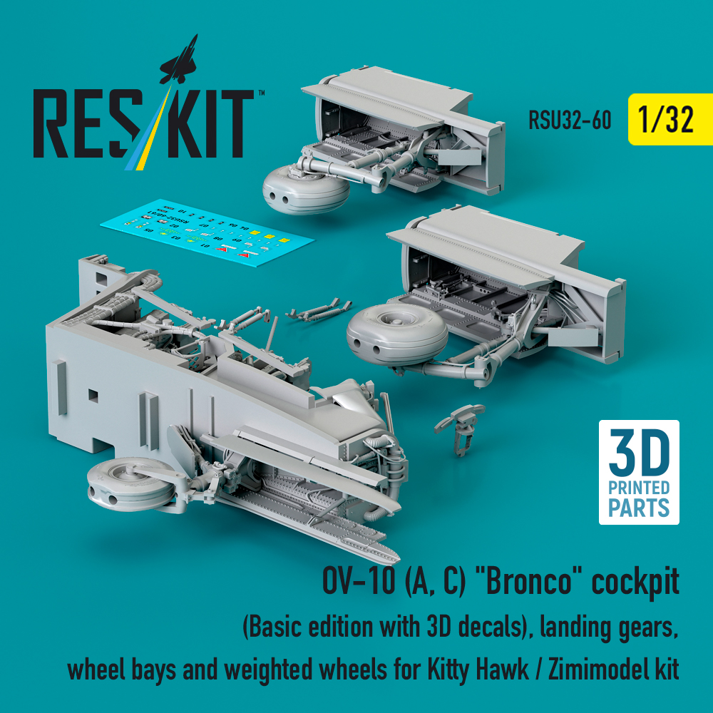 ResKit - 1/32 North-American/Rockwell OV-10A/OV-10C Bronco cockpit (Basic edition with 3D decals), landing gears, wheel bays and weighted wheels (for Kitty Hawk Model and Zimi Model kits) (3D-Printed)