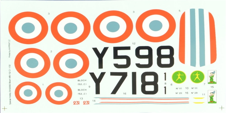 Special Hobby - 1/32 Bloch MB.152C-1 Early Version. The Bloch Mb 152C.1 was one of four pivotal fighter aircraft types the Arm?e de L'Air (or French Air Force) used in the defence of France in 1940. Alongside the Morane Saulnier Ms 406, Dewoitine D.520 and ex-US Curtiss H 75, they tried, although in vain, to stop the invading German Luftwaffe. As the development of this machine was not an easy one and the production was rather slow, the production machines failed to reach the operational units in large numbers before the war broke out on September 1, 1939. In fact, only one unit, the Groupe de Chasse Gc I/I had them on strenght. Later, during the Battle of France, the Bloch Mb 152 were already in use with the following units Gc II/I, Gc II/6, Gc II/9, Gc II/8, Gc II/10, Gc III/10, Gc I/8, Gc III/9 and also the Polish Gc I/145 although this unit was still in training. The Mb 152 were also used by many regional defence units which were known as Patrouilles A?riennes de D?fense and also naval fighter units had these machines. Initially, the production Mb 152C.1 machines were built with 90cm diameter of the cowling air intake, later machines were slightly improved by having the air intake with only 60cm diameter. However, both varieties used to fly together in the units. And it is the earlier type that is subject of our model kit.The plastic parts come in four runners, the clear canopy is injected and the engine and interior parts are made of cast resin. Smaller parts are contained in a PE-fret. The decal sheet caters for two machines, the first of which was personal mount of Marius Jean Paul Elzeard Ambrogi , famous WW1 hero and ace who had gained 14 kills during WW1 and managed also a further one in WW2. Its machine sported the usual French markings and also had a Disney dwarf on its tail. The other machine was flown by another ace, commander of the 1re escadrille Cne Germain Coutaud (8 victories in 1940) and it also carried a unit's badge.