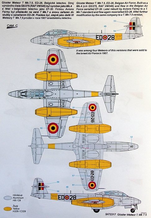 Special Hobby - 1/72 Gloster Meteor T Mk 7.5 1/72Gloster T Mk.7 trainer aircraft (available under no.72548) was one of the most widespread variants of the Meteor jet fighter aircraft. Only a handful of the Meteor T Mk.7 was equipped with a larger and squared off tail taken from the more modern Mk 8 fighter version. This new trainer variant got some what peculiar designation Meteor T Mk 7.5 (T Mk 7 ? was also used). While these planes were used in Great Britain mainly for various test flights and public shows, in the Belgian and Israeli air forces they served as standard training machines.The kit contains five frames of plastic parts, three of them in standard greyish styrene, the other two which contain the canopy and recce nose parts are made of clear plastic. The decal sheet offers markings for the Gloster company demonstration aircraft which was blue overall with white coloured stripes and civil registration codes. It was also equipped with non-standard wing-tip fuel tanks. The other British aircraft in this kit is the RAE test machine in dark blue overall and with a non-standard reconnaissance nose. This pair is accompanied by a silver Belgian machine with yellow trimmings and a camouflaged Israeli plane wearing a name on its nose (Ef´eh, ie Viper).[ ] More...