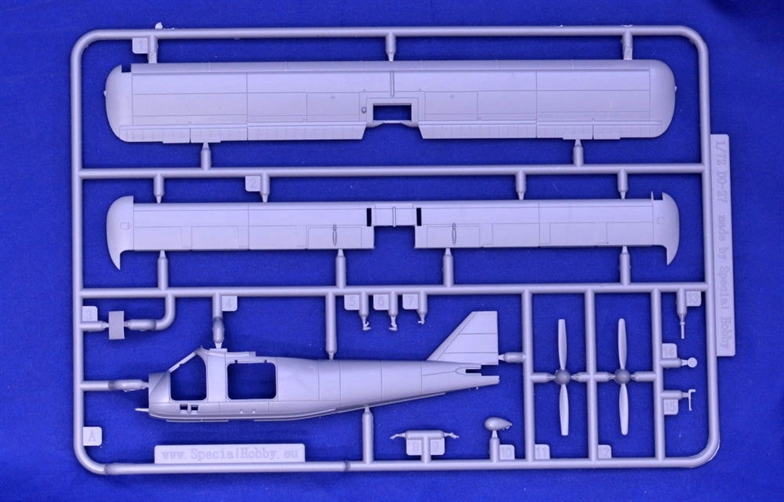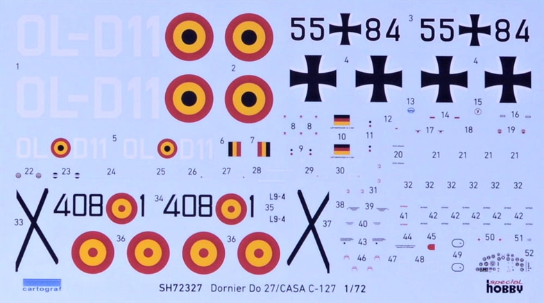 Special Hobby - 1/72 Dornier Do-27 German, Spanish and Belgian Service In the post war year, many German aircraft designers feared the possible ban on aircraft production and begun to leave the country. Among them also Claudius Dornier Jr., the son of the famous German WW2 aircraft builder. He settled in Spain where he founded company named Oficinas Técnicas Dornier (OTEDO). In the middle 50 s, the Spanish Air Ministry was looking for a new STOL aircraft and having received the order, Dornier designed the Dornier Do 25 type, a high wing aircraft for a crew of four. Two prototype airframes were built by CASA company in Spain, while in Germany, in rebuilt Dornier works, the type was redesigned to the Do 27, powered by the Lycoming GSO-480-B1B6 engine. This type was also finally put into production, becoming the first aircraft to be mass-produced in Germany after the war. In total, 428 airframes were built in several different versions and they were operated by all three services of the newly built German military, ie the air force, navy and land forces. At the same time, a 50-unit batch was also produced in Spain for their military, named the CASA C-127/U.9. The type s many versions differed mainly by the style of the undercarriage, engine and propeller used, the shape of the tail fin or by having either single or twin controls in the cockpit. The Dornier Do 27 was not only used by air forces of many European countries, namely by Portugal, Belgium, Sweden, Switzerland and some others, but also elsewhere over the globe. It could be seen flying in several African countries, in the State of Israel and also in Turkey. The type found its way to civil aviation market too and was quite liked by so-called bush pilots for its excellent performance in harsh conditions of irregular transport lines in Africa or South America. In Europe, the Do 27 served as touring or skydiving aircraft.This nicely detailed model originates in steel moulding tools and comes on four sprues of grey styrene and one sprue of clear parts which can be attached also in open position-meaning both the front cockpit door and the large fuselage window on either side of the fuselage to nicely show the busy interior of the model.The decal sheet offers markings for three machines. The German option portrays a machine in standard camouflage with high visibility orange wing tips, rudder and cowling panels and what makes her even more interesting, with black and white stripped propeller. The two other options is a Belgian plane olive overall and a Spanish one in aluminium over pale blue as it was operated in the Spanish Sahara.