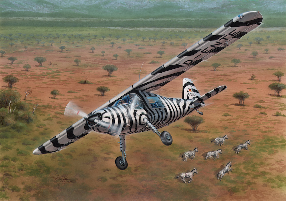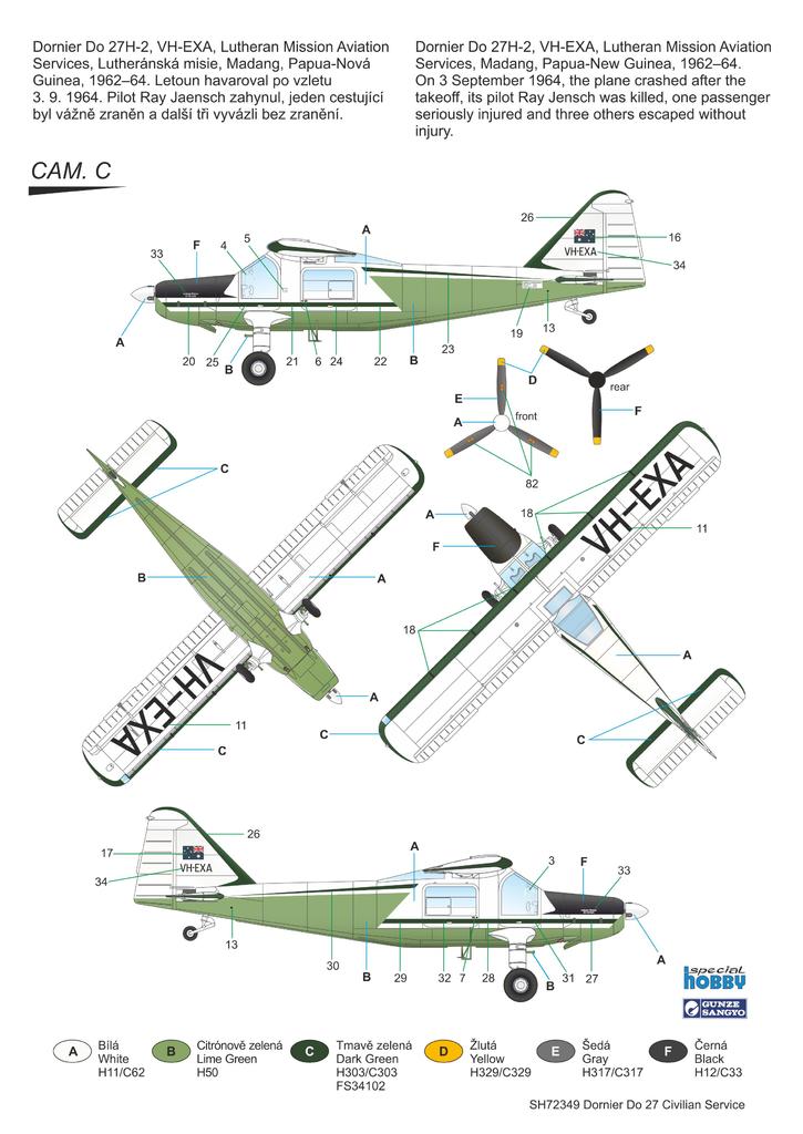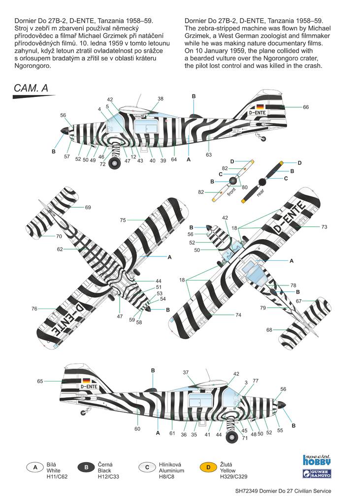 The decal sheet offers markings for three machines. The option A portrays the arguably most popular civilian Do 27 ever, the Zebra-stripped machine which was owned by biologist and film maker M.Grzimek and was flown in the skies of Africa. Option B brings an all-yellow Swiss machine and the final marking option depicts a quite unique machine which had Australian registration and was operated in Papua-New Guinea (administered by Australia prior 1975) by a Christian mission. The airframe was painted in white and two shades of green.