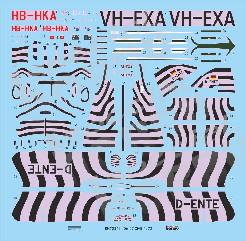 Special Hobby - 1/72 Dornier Do-27 Civilian Service In the post war year, many German aircraft designers feared the possible ban on aircraft production and begun to leave the country. Among them also Claudius Dornier Jr., the son of the famous German WW2 aircraft builder. He settled in Spain where he founded company named Oficinas Técnicas Dornier (OTEDO). In the mid 50 s, the Spanish Air Ministry was looking for a new STOL aircraft and having received the order for such an aircraft, Dornier designed the Dornier Do 25 type, a high wing aircraft for a crew of four. Two prototype airframes were built by CASA company in Spain, while in Germany, in the rebuilt Dornier works, the type was redesigned as the Do 27, powered by the Lycoming GSO-480-B1B6 engine. This type was also finally put into production, becoming the first aircraft to be mass-produced in Germany after the war. In total, 428 airframes were built in several different versions and they were operated by all three services of the newly built German military, ie the air force, navy and land forces. At the same time, a 50-unit batch was also being produced in Spain for their military, named the CASA C-127/U.9. The type s many versions differed mainly by the style of the undercarriage, engine and propeller used, the shape of the tail fin or by having either single or twin controls in the cockpit. The Dornier Do 27 was not only used by air forces of many European countries, namely by Portugal, Belgium, Sweden, Switzerland and some others, but also elsewhere over the globe. It could be seen flying in several African countries, in the State of Israel and also in Turkey. The type found its way to civil aviation market too and was quite liked by so-called bush pilots for its excellent performance in harsh conditions of irregular air transport in Africa or South America. In Europe, the Do 27 served as touring or skydiving aircraft.
