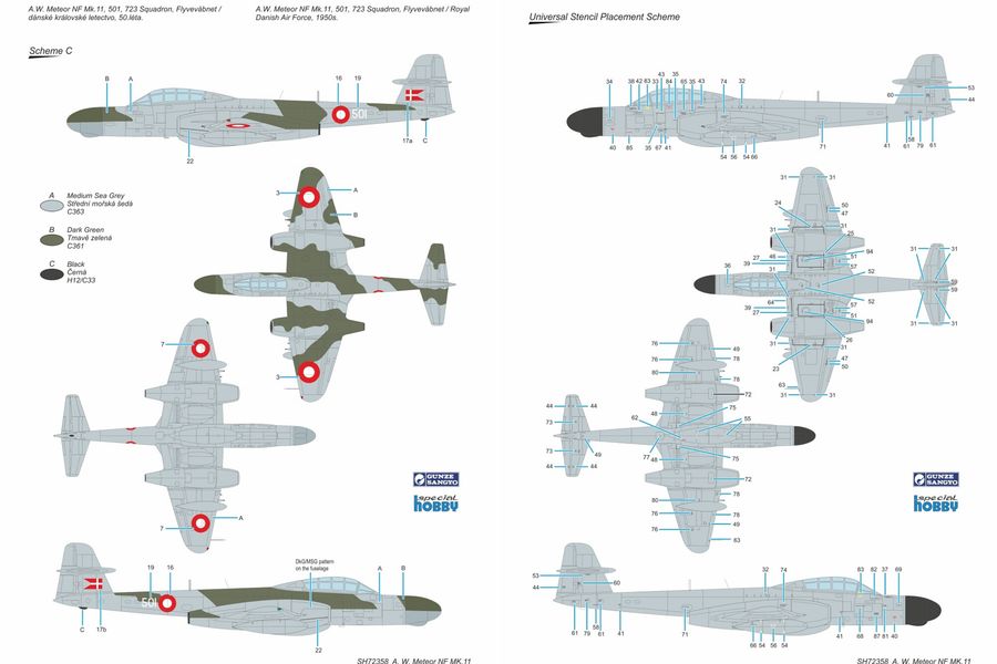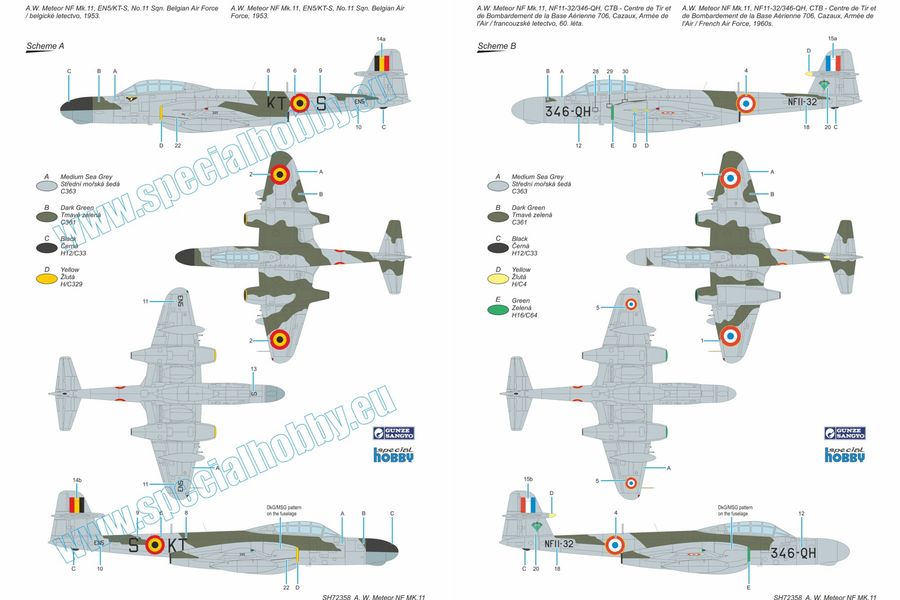 Special Hobby - 1/72 Gloster Meteor NF.11 Nato Users post WWII Belgium, France, Denmark This British all weather twin jet fighter aeroplane not only served quite a long time with the RAF, it was also exported with considerable success to a number of Nato countries as well as to the Middle East. Four grey styrene sprues, one clear plastic sprue. Decal sheet covering three options come with a full set of airframe stencils. Marking options for a Belgian, French and a Danish machines