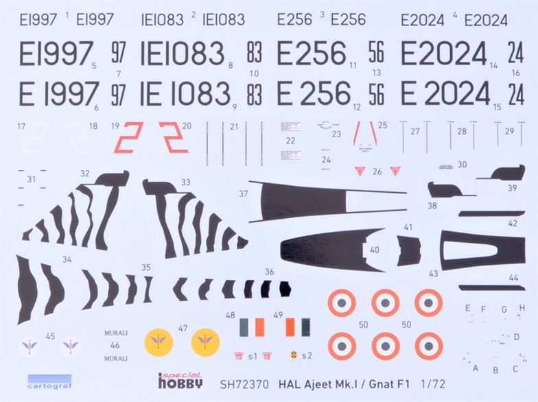 Special Hobby - 1/72 Ajeet Mk.I Indian Light Fighter In 1950, WE Petter, who was famous for designs such as the Lysander, Whirlwind and Canberra joined Folland company. By this time modern jet aircraft were becoming bigger, more complex and expensive as their performance increased and as a result the development and operating costs were rising too. WE Petter decided to pursue a different approach to the modern jet-fighter philosophy by designing a light-weight fighter aircraft which was to have been powered by a pair of low thrust turbojet engines although this was later changed to a single power unit as their power output of jet engines increased. By choosing to build this new jet aircraft to the smallest overall dimensions possible and with only the very basic equipment required for the job this kept the total overall price down to only a third of the price of a standard jet fighter bomber of the day yet it would offer similar performance to these much bigger and more expensive jets. The initial design incorporated a pilot lying in a prone position in the nose of the aircraft and a twin engined configuration which was used in the Fo.139 Midge test aircraft which had been designed and built to assess the aerodynamical features of the future Gnat.