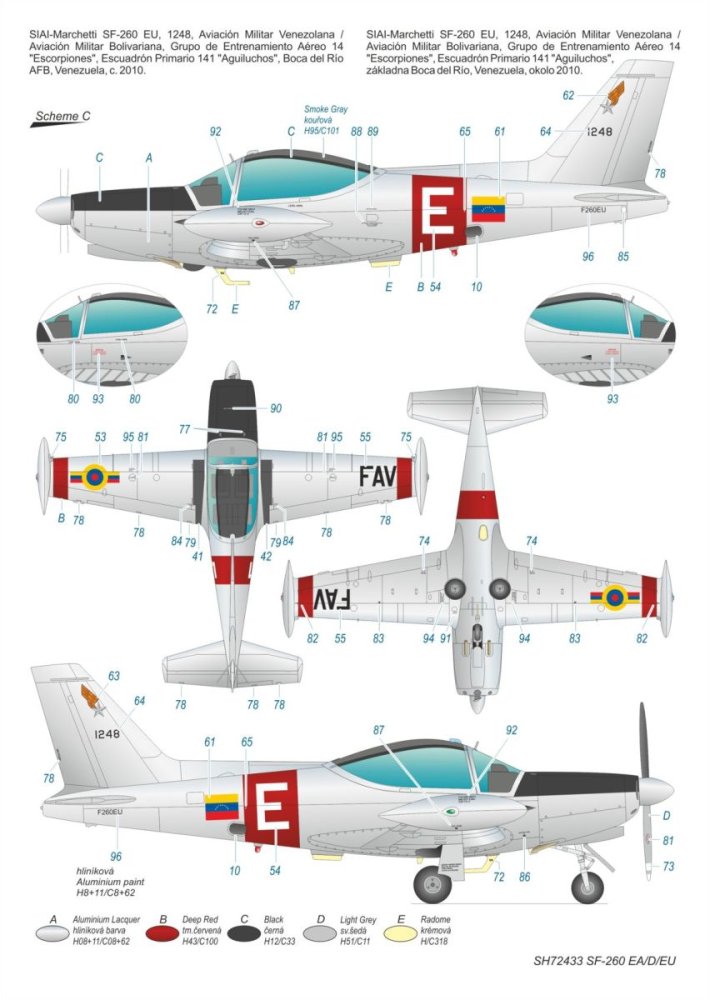 Our model of the later version differs from our earlier release no. SH72418 by having this new clear sprue with the larger canopy. The decal sheet brings markings for an Italian machine with nose art on either side of the fuselage, then a Belgian machine and also two eye-catching machines as flown in Latin America an aluminium lacquer overall machine from Venezuela and white SF-260 from Uruguay with orange trim.