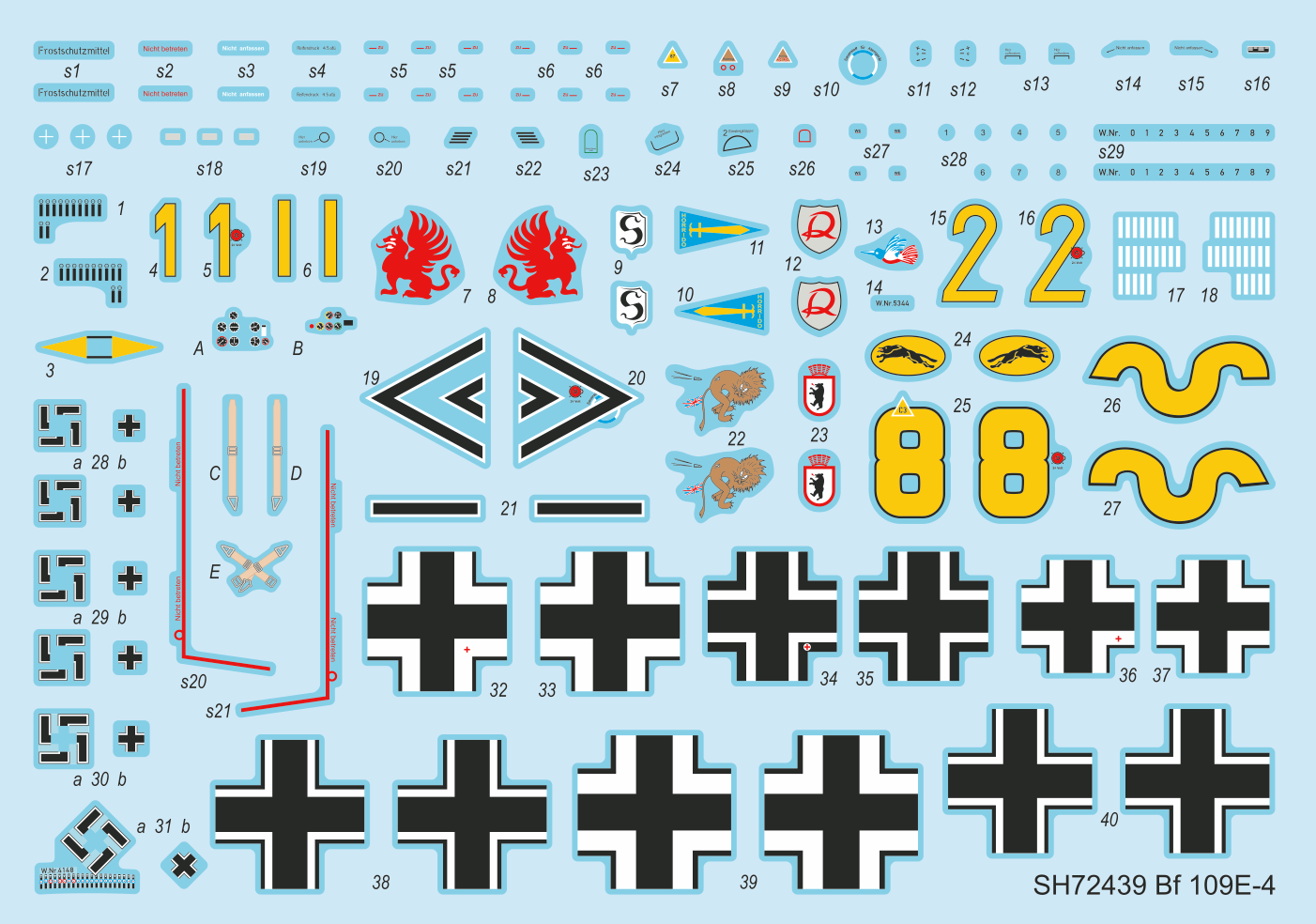 Special Hobby - 1/72 Messerschmitt Bf-109E-4 with schemes of two German fighter aces, G.Schopfel and H.Wick who, flying from bases in Western Europe, took part in the Battle of Britain. The kit also contains two more options, these being Emils as operated over the Balkans a year later. Decals of Wick's machine contain also the fuselage camouflage mottles consisting of a myriad of tiny brush-made blotches. The kit parts are laid out into two grey styrene sprues and one with clear parts. The kit offer the option to build the Emil either with the engine and fuselage machine guns cover panels open or closed. The wing flaps and slats can be posed in the down position, ailerons offer the option as well highly accurate and extremely detailed model easy build option to display the engine in the open nose section flaps and slats can be posed open too accurate decals for four schemes, including full set of stencils separately available are clear part and wheel painting masks more detail sets being prepared