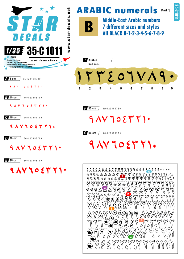 Star Decals - 1/35 Arabic numerals #1. Generic BLACK numbers in 7 sizes and styles