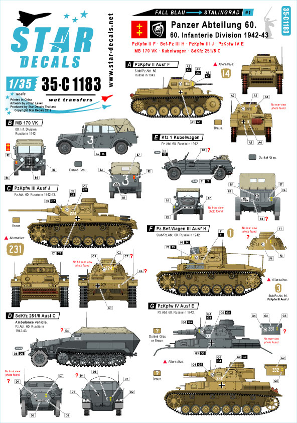 Star Decals - 1/35 Fall Blau and Stalingrad Part 1. Pz-Abteilung 60 / 60. Infanterie Division 1942-43. Pz.II Ausf.F, Pz.III Ausf.J, Pz.IV Ausf.E, Mercedes MB 170 VK, Kubelwagen, Sd.Kfz.251/8 Ausf.C.
