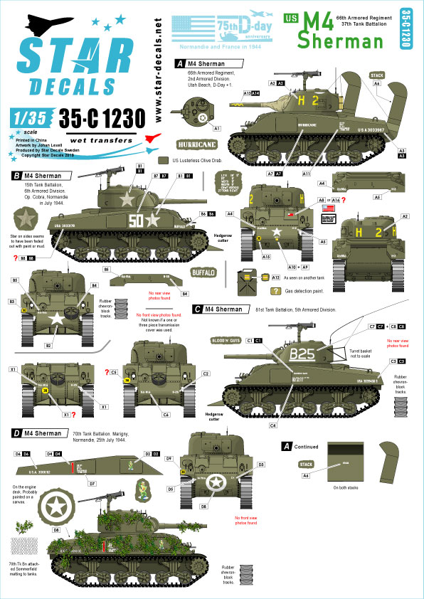 Star Decals - 1/35 US M4 Sherman. 75th-D-Day-Special. Normandy and France in 1944.