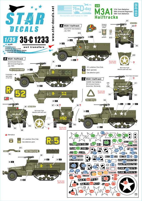 Star Decals - 1/35 US M3A1 Halftracks. 75th-D-Day-Special. Normandy and France in 1944.
