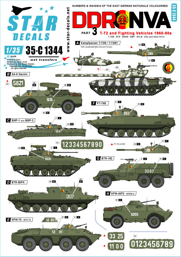 Star Decals - 1/35 DDR-NVA Part 3. East Germany. T-72 and Fighting Vehicles 1960-80s. Generic smaller numbers, and national insignia (Soviet]