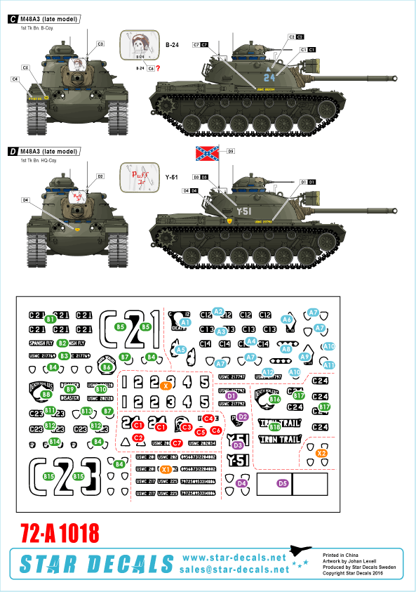 Star Decals - 1/72 US Marines in Vietnam. M48A3 Late model (raised cupola). 1st Tank Battalion.