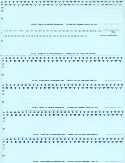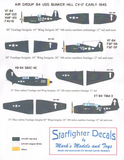 Starfighter Decals - 1/350 Air Group 84 Early 1945. ONLY DECALS. Decal set contain markings for around 90 aircraft including the G markings, numbers, and National Insignia for:VF-84 flying Vought F4U-1D, F6F-5N Corsair, and Grumman F6F-5P VMF-221 flying F4U-1D VFM-451 flying F4U-1D VB-84 flying SB2C-4E VT-84 flying TBM-3. Can be used with any of the 1/350 aircraft from Trumpeter, Hasegawa, Cyber Hobby, and various resin aircraft.