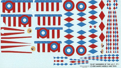Starfighter Decals - 1/72 Aef Showbirds Part 1. Designed for the Eduard Spad 13C.1 (Late) kit. Markings for two aircraft: 'Diamond Dick' and 'Flag Bus' Special Air Show Markings from the 94th Aero Squadron 1919 (for Eduard kits)