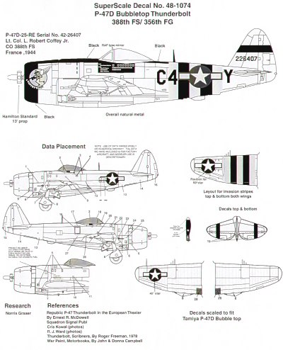 Microscale - 1/48 Republic P-47D Thunderbolt bublbetop (1) 42-26407 C4-Y 388 Fs Lt Col Robert Coffey France 1944 D-Day stripes