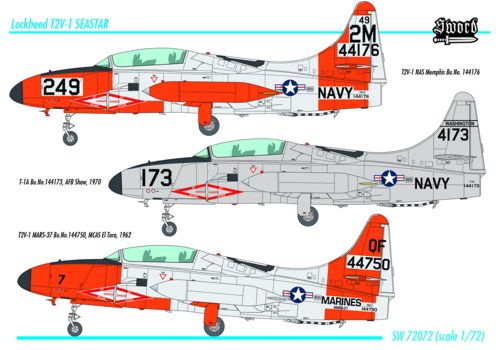 Sword - 1/72 Lockheed T2V-1 Seastar: 1.NAS Memphis Bu.No. 144176 2.MARS-37 Bu.No.144750 MCAS El Tora 1962 3.T-1A Bu.No.144173 AFB Shaw 1970 Model contains PE parts