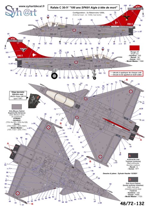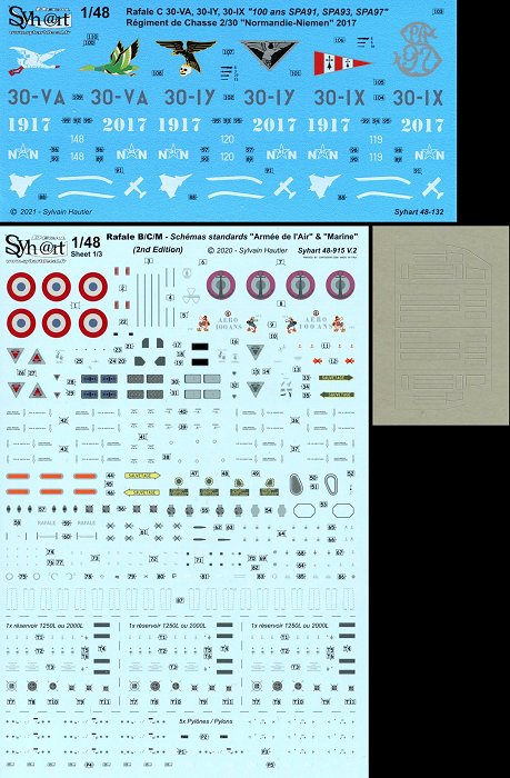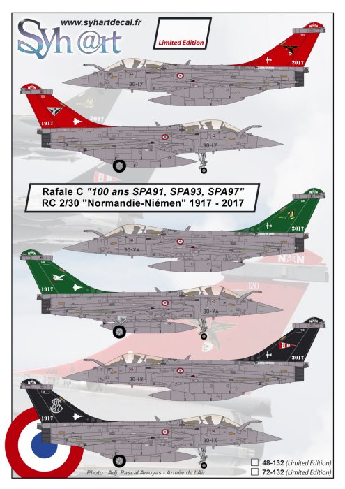 Syhart - 1/48 Dassault Rafale C '100 years Spa 93, 97, 91' Rc 2/30 Normandie-Niemen 2017.The 'Normandie-Niemen' is one of the most famous squadrons of the French Air and Space Force, memoring the historical traditions of the French pilots who joined Russia during the World War II to form this FAFL* squadron from 1942 within the Russian Air Force, like the other Fafl squadrons formed within the Royal Air Force since 1940. (*FAFL: Free French Air Forces).