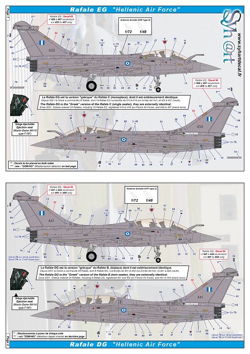 This decal set is an updated version at 1/48 or 1/72 of the Syhart 920 set released on 2022, it allows to accurately reproduce any of the Greek Rafales Eg or Dg including two sets of roundels, flags and squadron checkerboard fin flash.