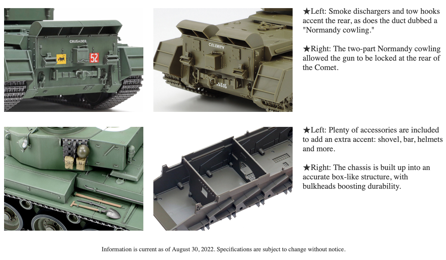 - This is a 1/35 scale plastic model assembly kit. Length: 219mm, width: 88mm. Extensive study of full-size Comets underpins this accurate rendering of the boxy hull with larger turret and 77mm gun. Cast metal armor surfaces on the hull and turret front are realistically depicted, as is the shape of the canvas gun shield cover. Assembly type tracks employ one piece straight sections. Choose between connected and separated 'Normandy cowling' designs for the rear. A clear part is used to recreate searchlight lens. Comes with two crew torso figures in winter gear, with two vehicle marking options also included in the kit.
