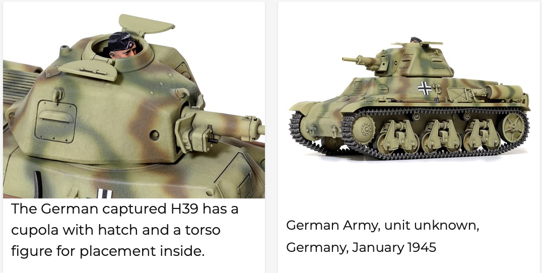 Tamiya - 1/35 French Light Tank H39. This plastic model assembly kit recreates the H39, a light tank which served in French forces at the time of the German invasion in 1940. Tamiya designers studied the full-size vehicle in depth during the making of this model. The model can be made into a French or a German captured vehicle, with the latter featuring a turret-top cupola and an antenna base. Assembly type tracks feature one-piece straight sections. Features a full body French soldier figure and a German soldier torso. 1 marking option each for French and German vehicles.