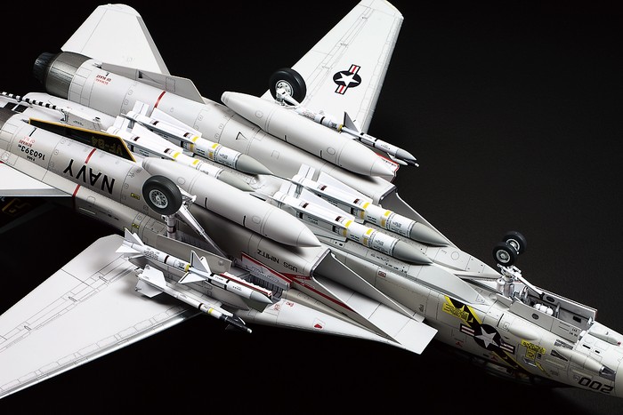 This specific model kit depicts the F-14A Tomcat variant. The F-14A was the initial two-seat, twin-engine, all-weather interceptor fighter variant for the U.S. Navy. It first flew on December 21, 1970. As a U.S. Navy fighter it fulfilled the dual roles of long range interceptor and air superiority fighter, and later bomber. Deployed from 1974 to 2006, it successfully employed a "swing wing", which offered variable sweep. The F-14A, which covers most of the early variants, was the most prolifically-produced variant of the Tomcat. 79 were exported to Iran before U.S.-Iranian relations began to deteriorate, and later took part in the Iran-Iraq War.