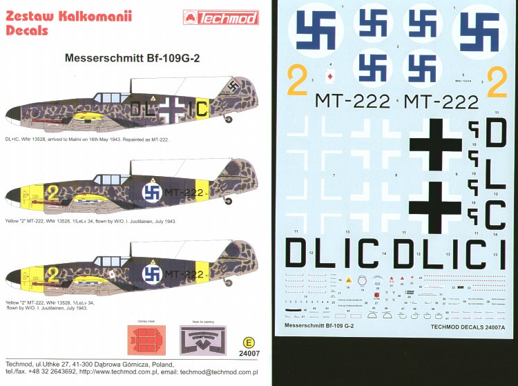 Techmod - 1/24 Messerschmitt Bf-109G-2 in Finnish service (3) DL+IC in delivery scheme and two versions as Yellow 2 MT-222 with 1/LeLv 34. Inc canopy and spinner paint masks