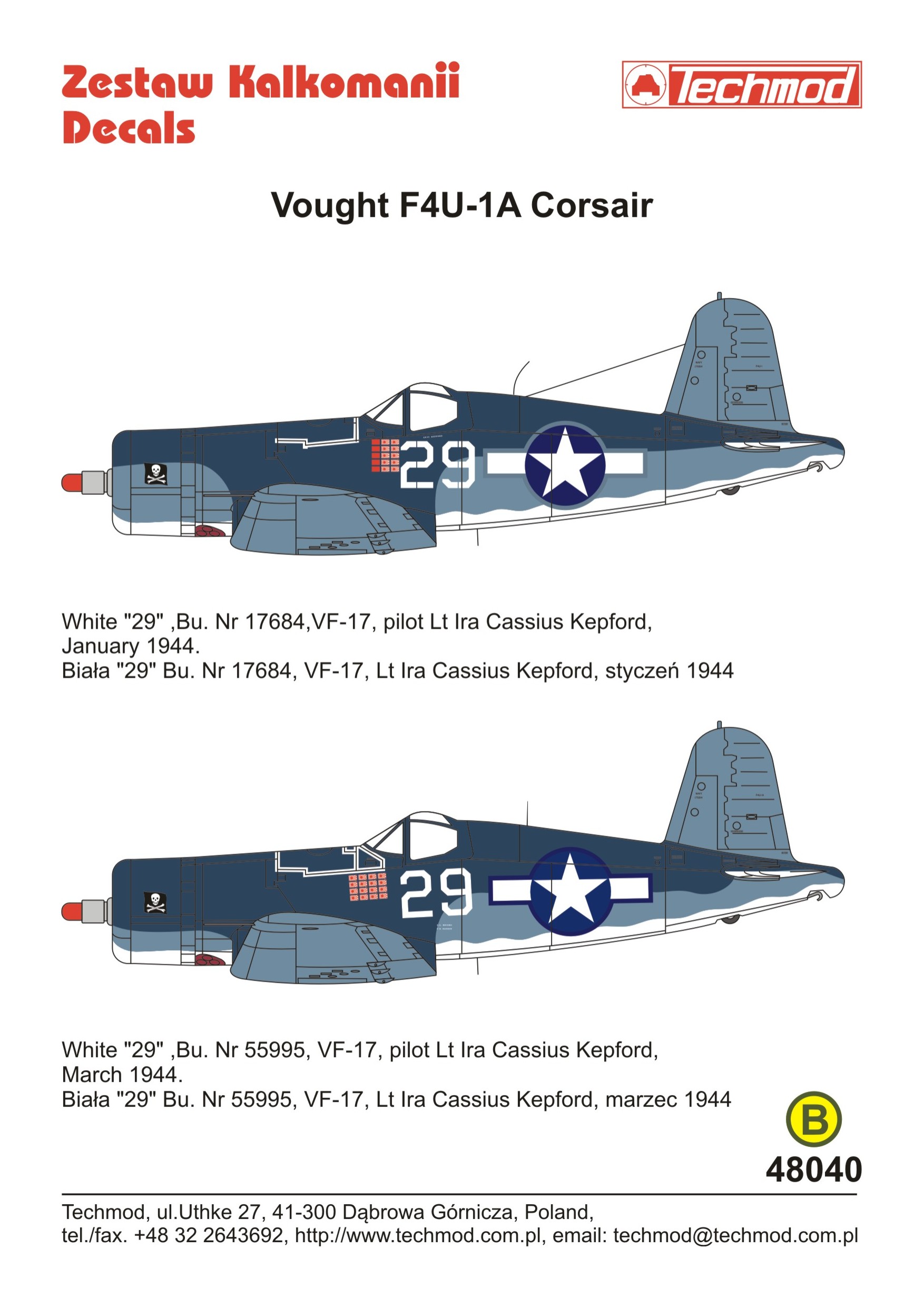 Techmod - 1/48 Vought F4U-1A (2) White 29 VF-17 x two Corsairs both flown by Lt Ira Cassius Kepford..