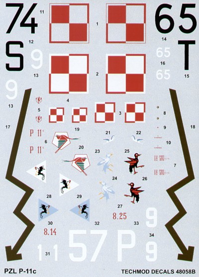 Techmod - 1/48 Pzl P.11C Part 2. (4) White 9 161 Fighter Sqn, White 65 142FS, White 1 112FS, White 9 132FS. all Khaki/Lt Blue