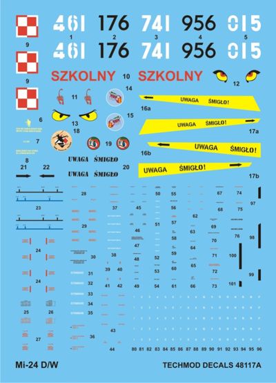 Techmod - 1/48 Mil Mi-24D/W [Mi-24W] Mi-24D "Hind-D", "461″, Polish Army Aviation, Operation "Iraqi Freedom", Ad Diwaniyah, Iraq 2007 Mi-24D "Hind-D", "015″, Training Center of Engineering and Aviation, Polish Air Force, Oleśnica, Poland 2001 Mi-24W "Hind-E", "956″, Polish Army Aviation, ISAF, Ghazni, Afghanistan 2013 Mi-24D "Hind-D", "176″, Polish Army Aviation, 49th Air Base, Poland 2012 Mi-24W "Hind-E", "741″, 56th Attack Helicopters Regiment, Polish Army Aviation, Inowrocław, Poland 2002
