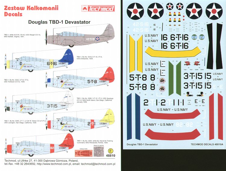 Techmod - 1/48 Douglas Douglas TBD-1 Devastator Pre War (6) 42-S-16 VS-42 Uss Ranger 1941 overall grey; 6-T-16 VT-6 Uss Enterprise Blue tail; 5-T-8 VT-5 Uss Yorktown Red tail 1939; 3-T-15 VT-3 Uss Saratoga White tail 1938; 2-T-1 VT-2 US Lexington Yellow tail 1938; White 82 Naval Air Training Command Nas Pensacola Red tail. All aluminium fuselages with yellow wings. Inc Paint masks