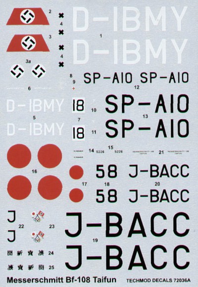 Techmod - 1/72 Messerschmitt Bf-108B Taifun Part 2. (4) D-IBMY International Circuit of the Oasis race Egypt 1937, SP-AIO Central Staff of the Aviation League Poland 1947-48, Black 58 Army Aviation Experimental Center Japan, J-BACC Manchuka Airlines 1936-37