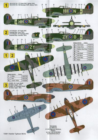 Techmod - 1/72 Hawker Typhoon Mk.Ib HN-N EK139, 175 Sqdn RAF, Spring 1943. HH-N139, 195 Dywizjon RAF, Wiosna 1943. ZY-B EK224, 247 Sqdn RAF, Bradwell Bay, June 1943. ZY-B EK224, 247 Dywizjon RAF, Bradwell Bay, czerwiec 1943. EJ906, 451 Sqdn RAAF, EL Daba, Egypt 1943. EJ906, 451 Dywizjon RAAF, El Daba, Egypt, 1943. PR-D R7855, 609 Sqdn RAF, A. Lallemant, Manson, February 1943. PR-G R7752, 609 Dywizjon RAF,A. Lallemant, Manson, luty 1943.