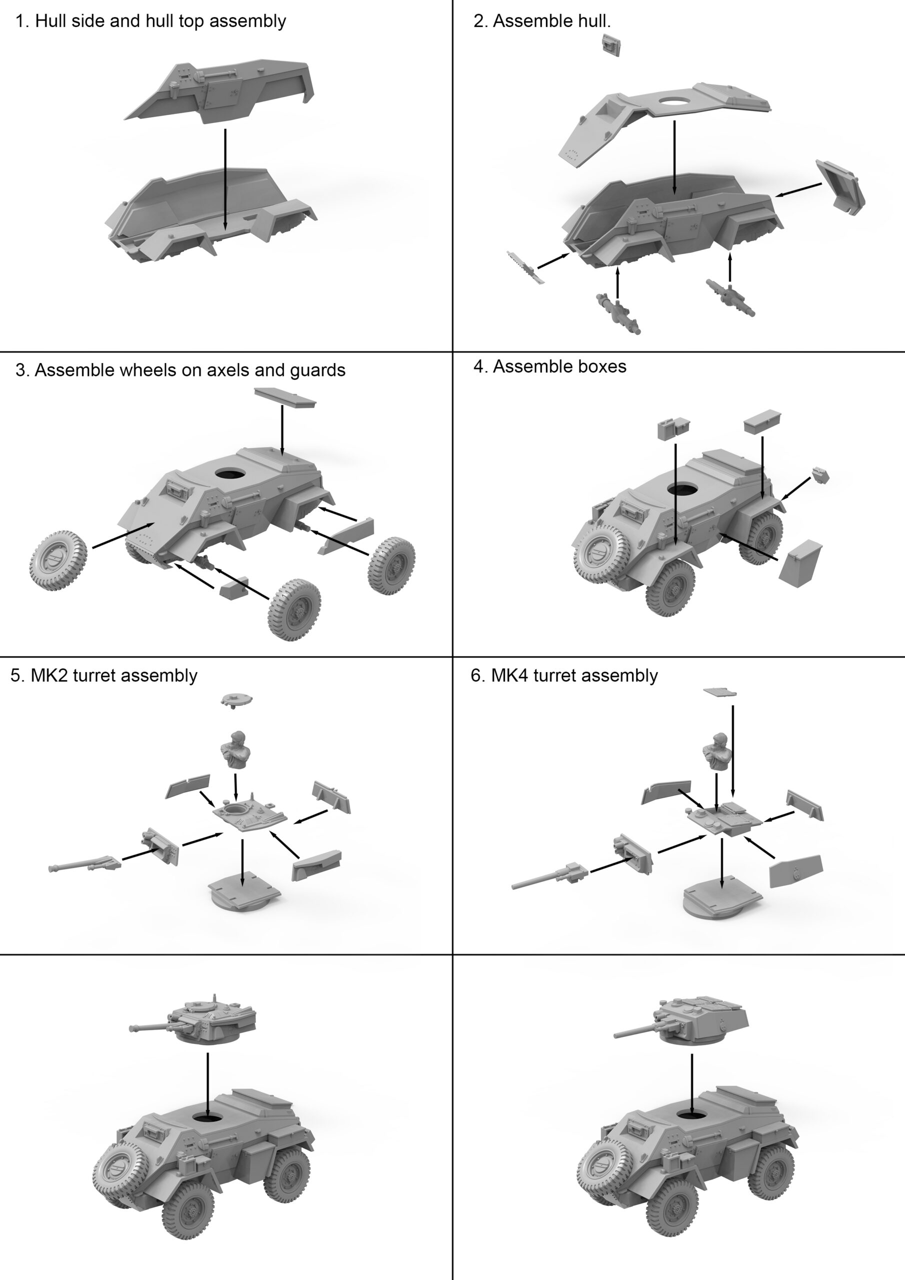 This hard plastic kit contains 3 vehicles with 6 commander figures and has options to build either Mk.II or Mk.IV variants