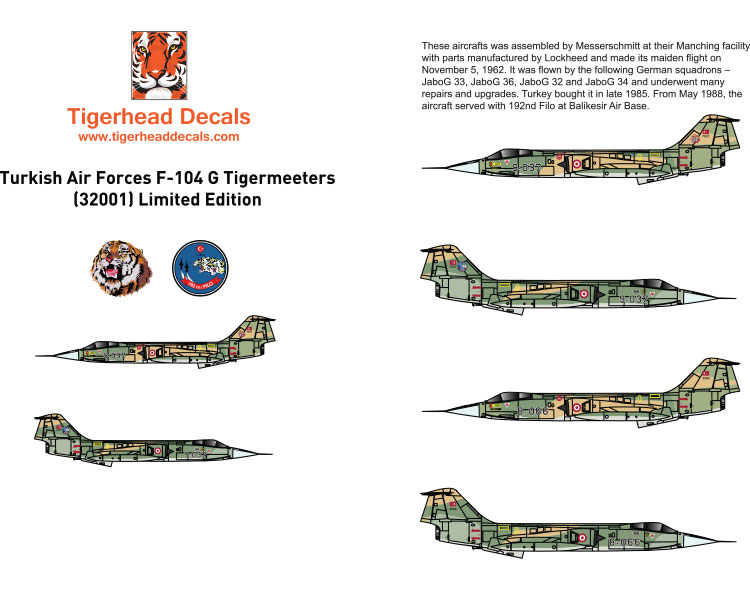 Tigerhead Decals - 1/32 Turkish Air Forces Lockheed F-104G Starfighters Tigermeeters Turkey is one of the very first countries to receive the F-104Gs within the MAP program. As a preparation for the new aircraft the 144th Squadron was organised at the 4th AB in Mürted-Ankara. The first 15 aircraft arrived on May 10th,1963 by sea and they were deployed at the newly founded squadron in July. In July 1963 two TF-104gs arrived and they were also assigned to the same squadron. This was followed by Canadair produced 18 F-104Gs and 2 TF-104Gs. The shipment continued in 1965 with 5 more Canadair built F-104Gs. All of these planes were deployed at the 144th Squadron. In 1968 3 pcs F-104G and 1 pc TF-104G were received from USAF. The TuAF faced with the US embargo after the Cyprus peace-keeping Operation ordered a batch of 18 F-104S from Italy. 6 of the planes were delivered within the same year and the remainder in 1975 on the basis of the planes per month. In 1975 the purchase was risen to 40 planes all which were received within 1976. The CF-104s, F-104Gs, TF-104Gs and the RF-104Gs which were strated being replaced by more modern aircraft were despatched to Turkey. This operation included 17 pcs F-104Gs from Belgium, 43 pcs F-104Gs & 12 pcs TF-104Gs from Holland, 12 pcs RF-104G and one TF-104G from Norway and 165 pcs F-104Gs and 36 pcs TF-104Gs from Germany. Canada also promised to hand over the CF-104s after being replaced by the F-18A/Bs. In 1986 44 pcs CF-104G & 6 pcs CF-104D were received. These planes were allocated to the 181st and to the 182nd Squadrons.