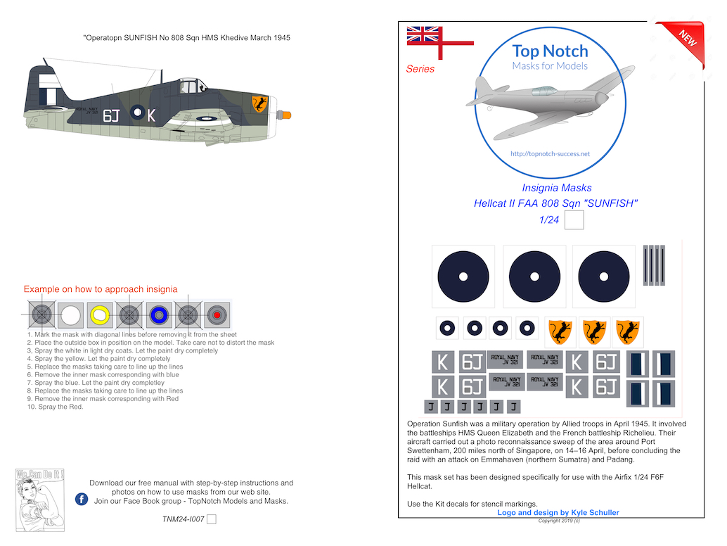 Top Notch - 1/24 Faa 808 Sqn 'Sunfish' Royal Navy Grumman Hellcat National Insignia paint mask (for Airfix kits)