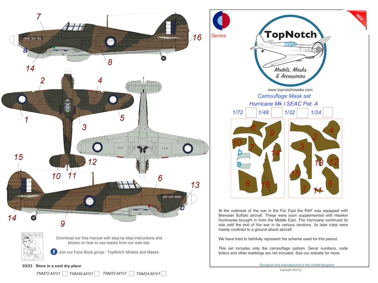 Top Notch - 1/24 Seac Hawker Hurricane Mk.I Pattern A Camouflage pattern paint masks (for Airfix and Trumpeter kits)