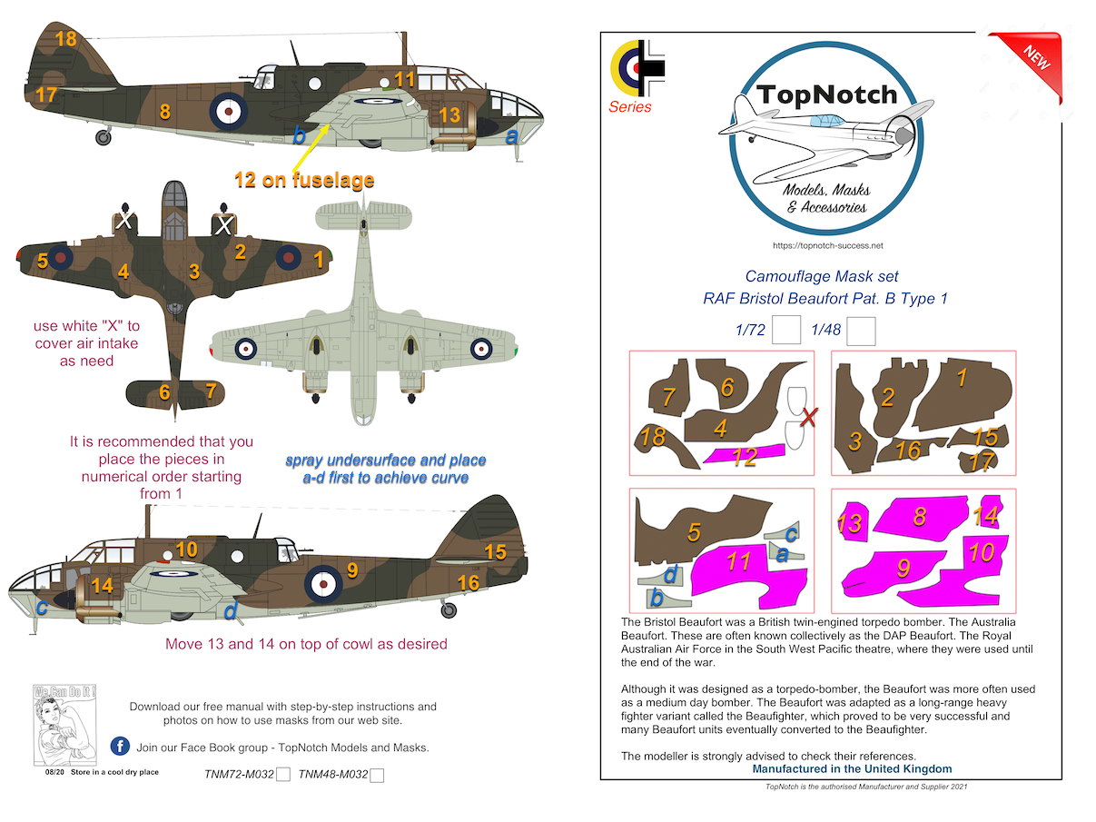 Top Notch - 1/48 Raf Bristol Beaufort Mk.I Pat. B Type 1 camouflage pattern paint mask (for Icm kits)