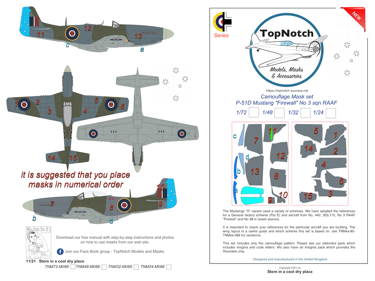 Top Notch - 1/48 North-American P-51D Mustang 'Firewall' No 3 sqn Raaf camouflage pattern paint mask (for Airfix, Eduard and Tamiya kits)