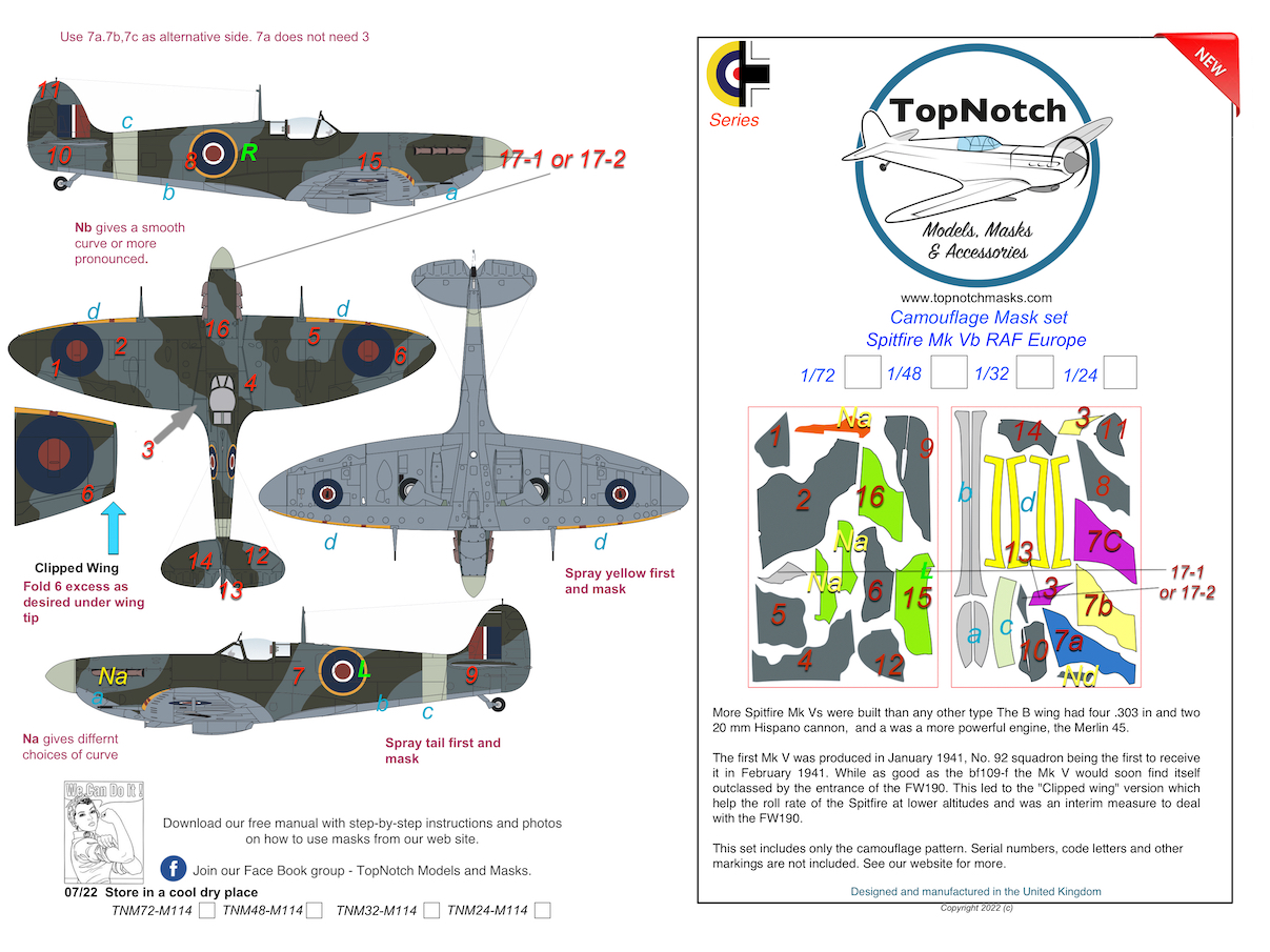 Top Notch - 1/48 Supermarine Spitfire Mk.Vb Raf Europe camouflage pattern paint masks (for Airfix, Eduard, Icm and Tamiya kits)