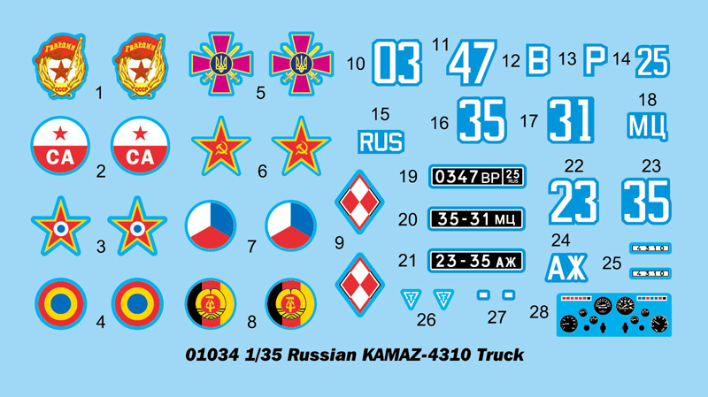 Trumpeter - 1/35 Soviet KAMAZ 4310 Truck. The KamAZ-4310 general utility truck is produced since 1980. It is a militarized version of commercial vehicle. Since it's introduction the KamAZ-4310 become the work horse of the Soviet military.