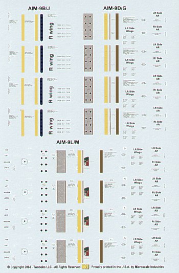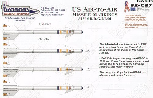 Two Bobs - 1/32 US Air-to-Air Missile Markings for AIM-9B/D/G/J/L/M and AIM-7E-2/M. Now you can smarten up the missiles on your model with authentic coloured bands and markings etc