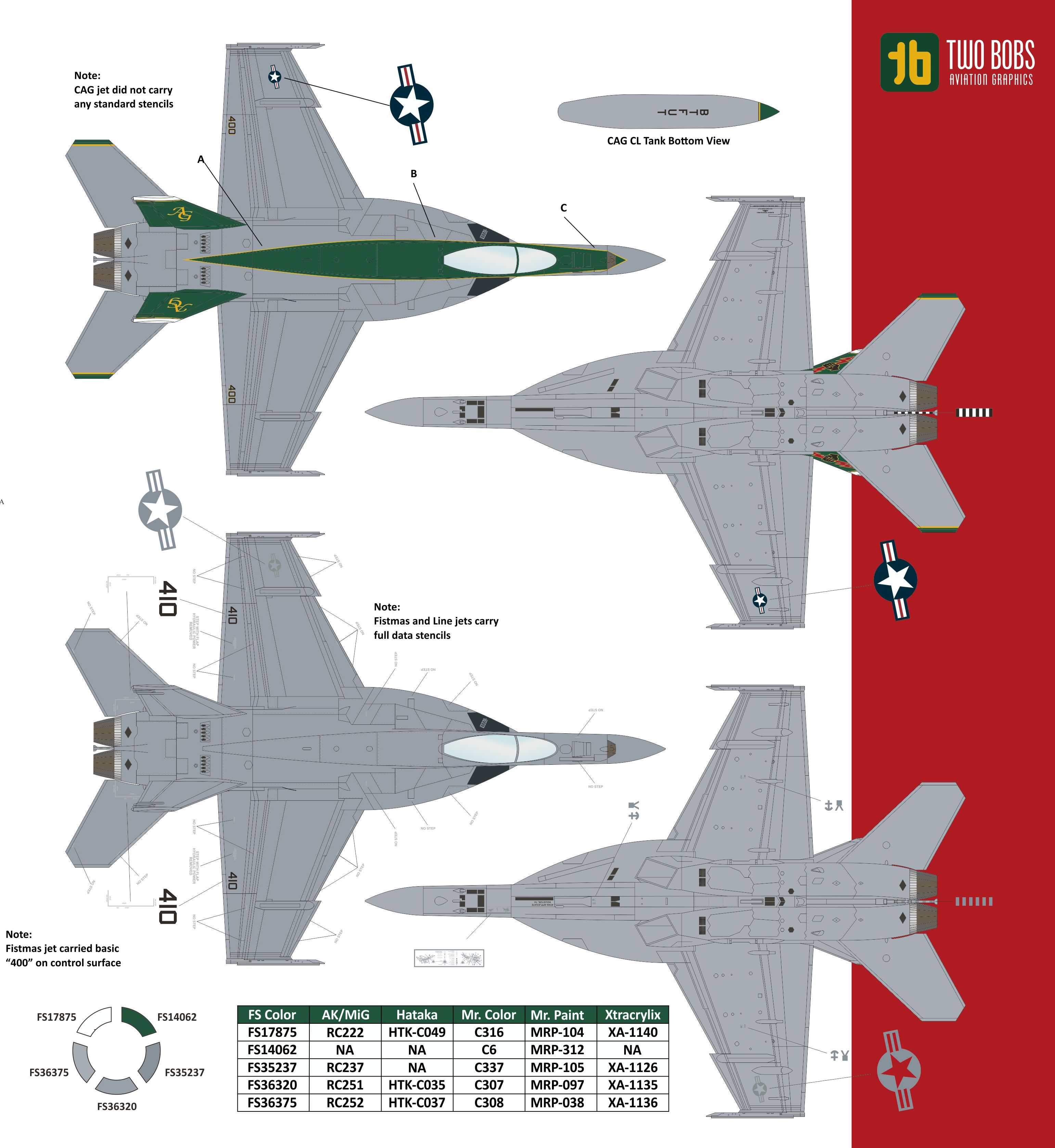 There are enough markings on this sheet for two complete aircraft to include the Cag scheme, the Merry Fistmas jet as well as nine line jets from the squadron.Full stencils are provided.
