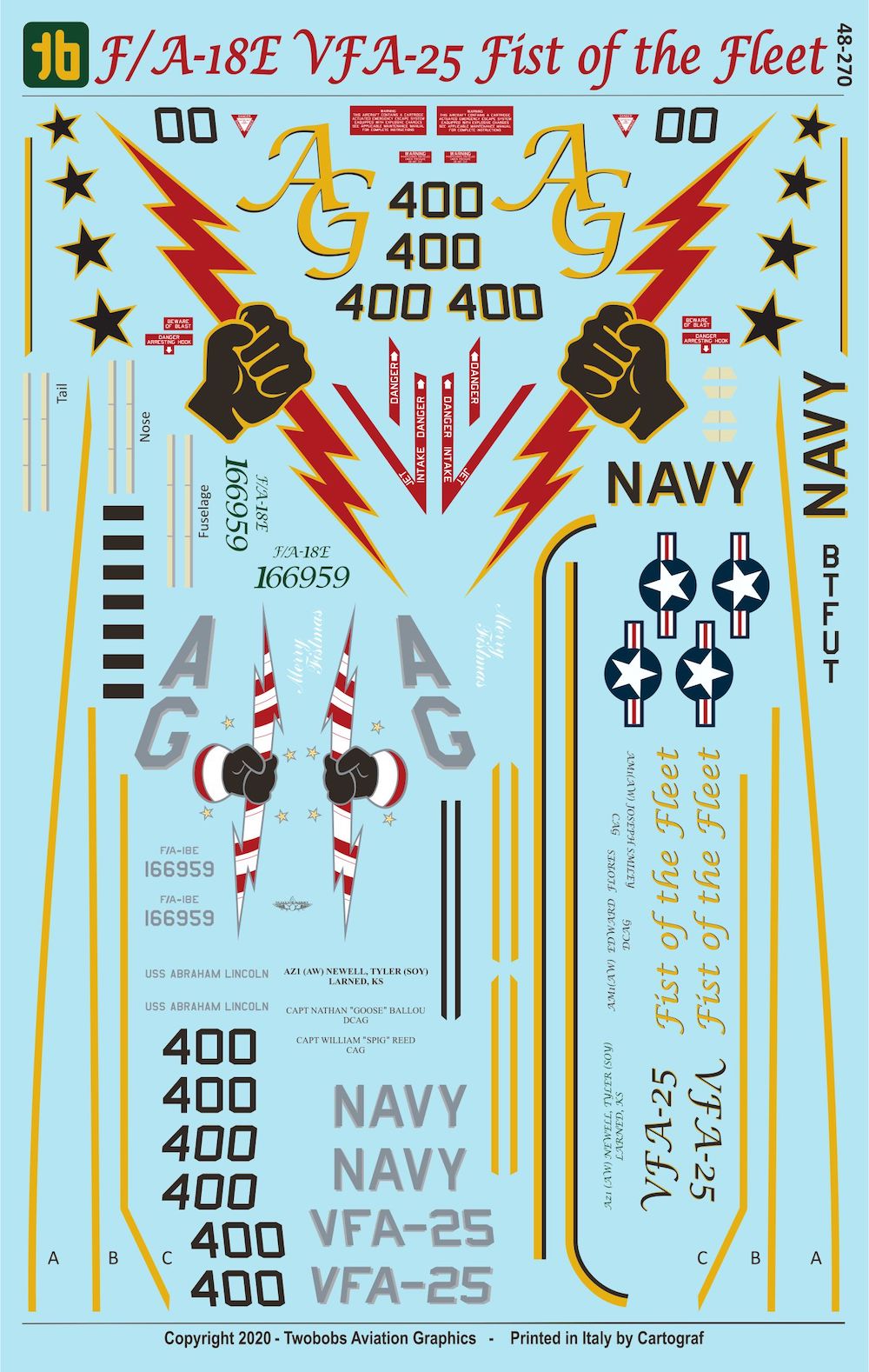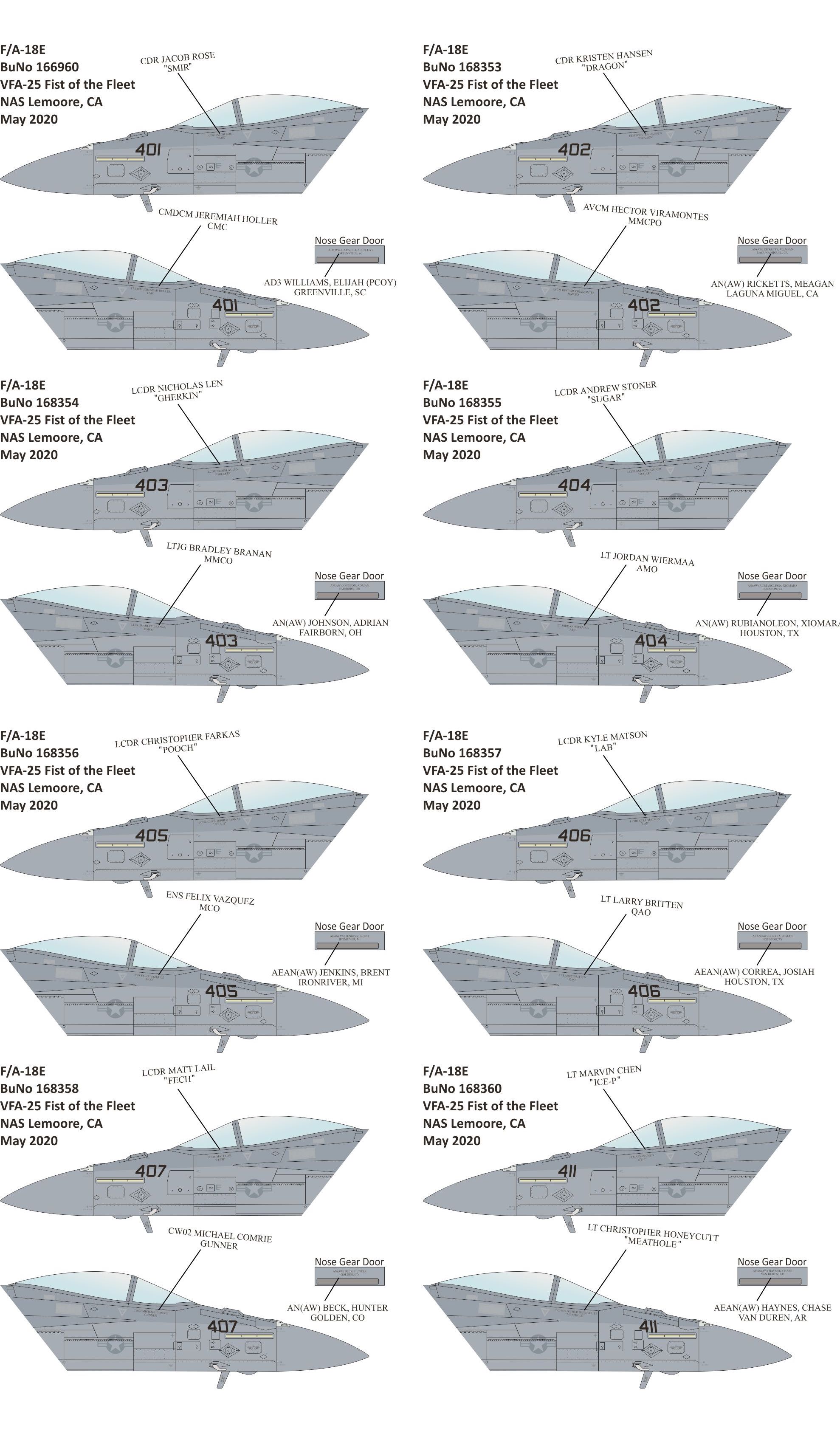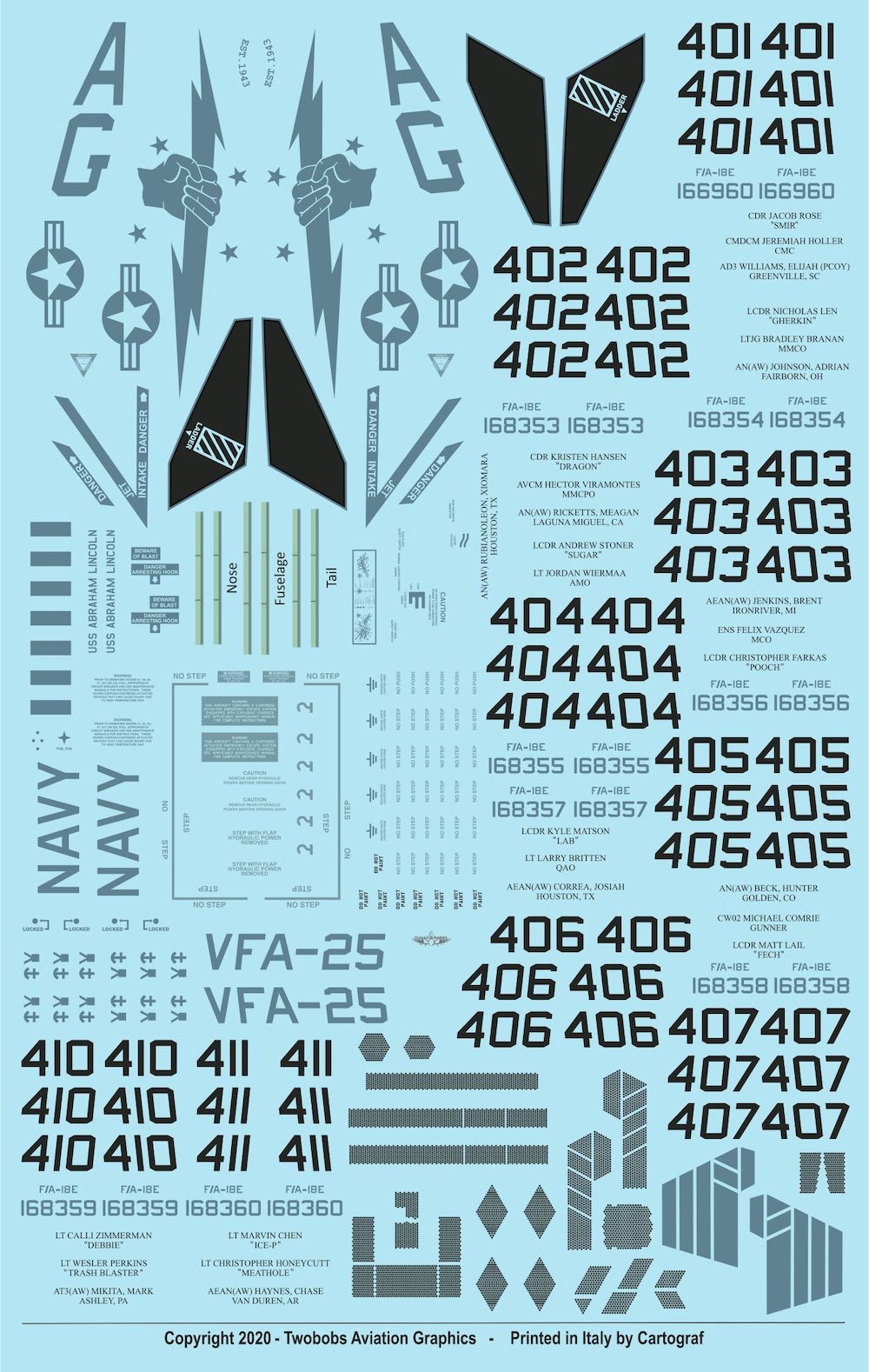 The Cag markings on this sheet were designed by Wesley Perkins who is a pilot with VFA-25 and pays homage to the scheme previously carried by the A-7E.