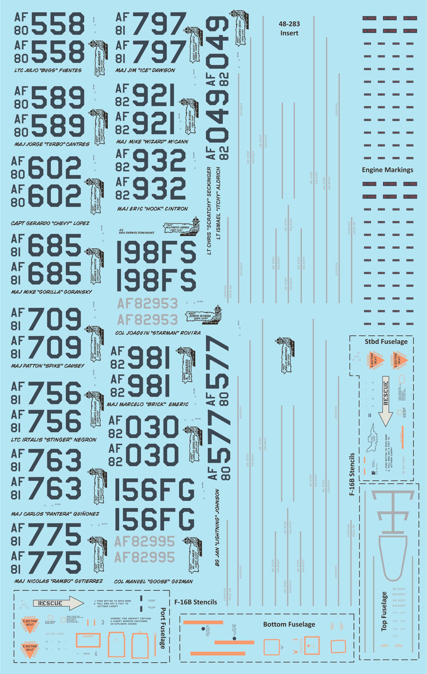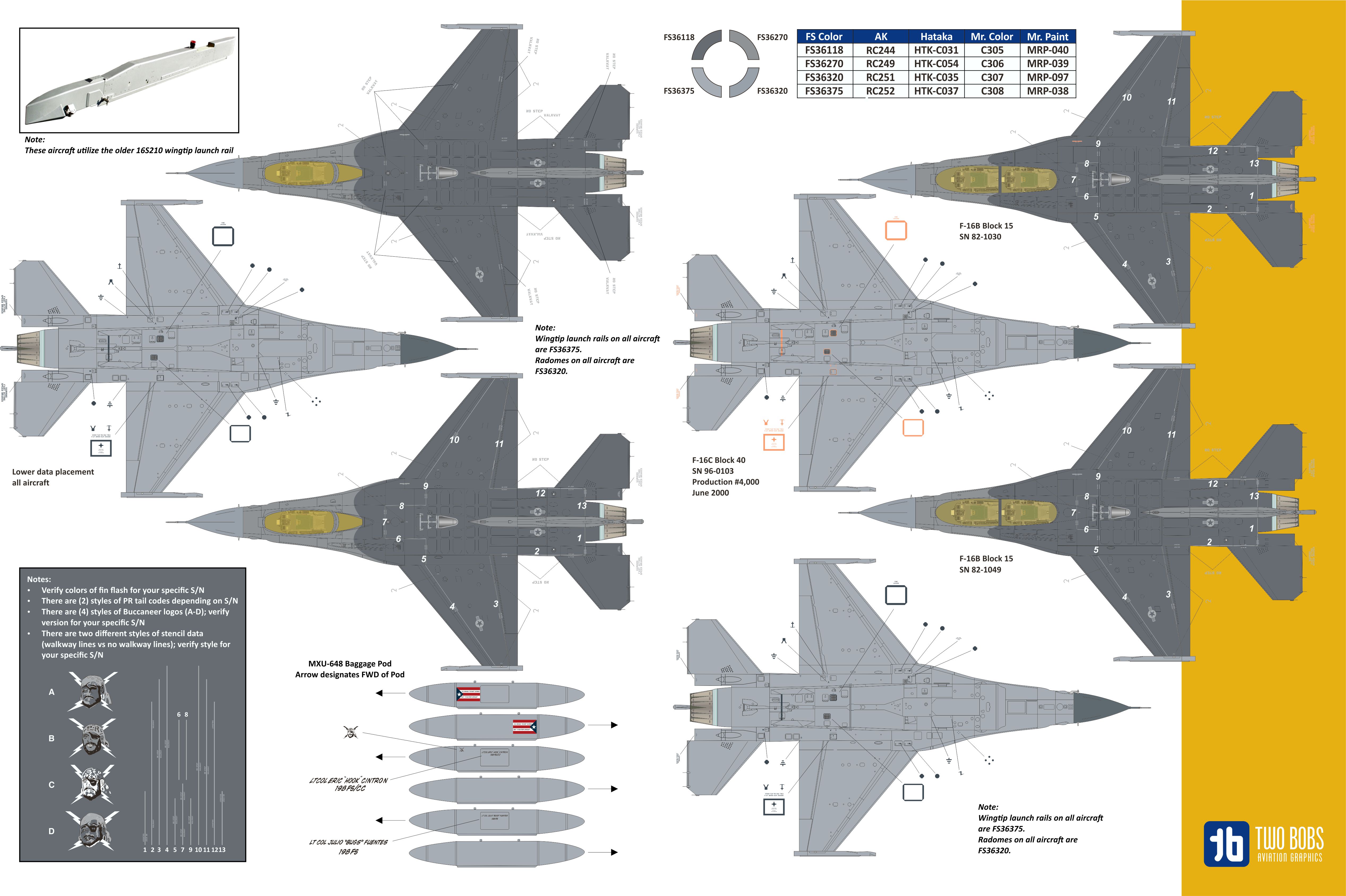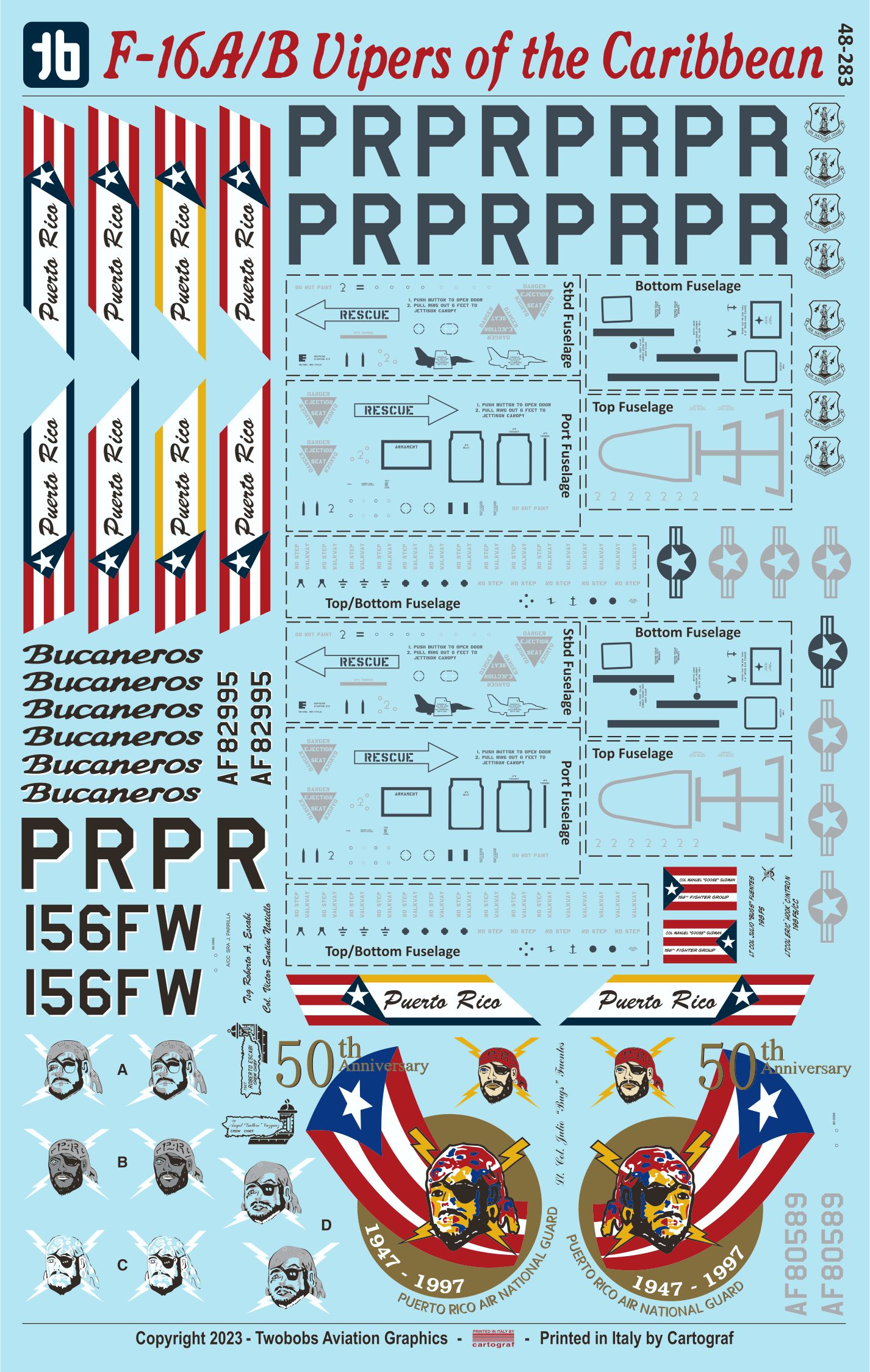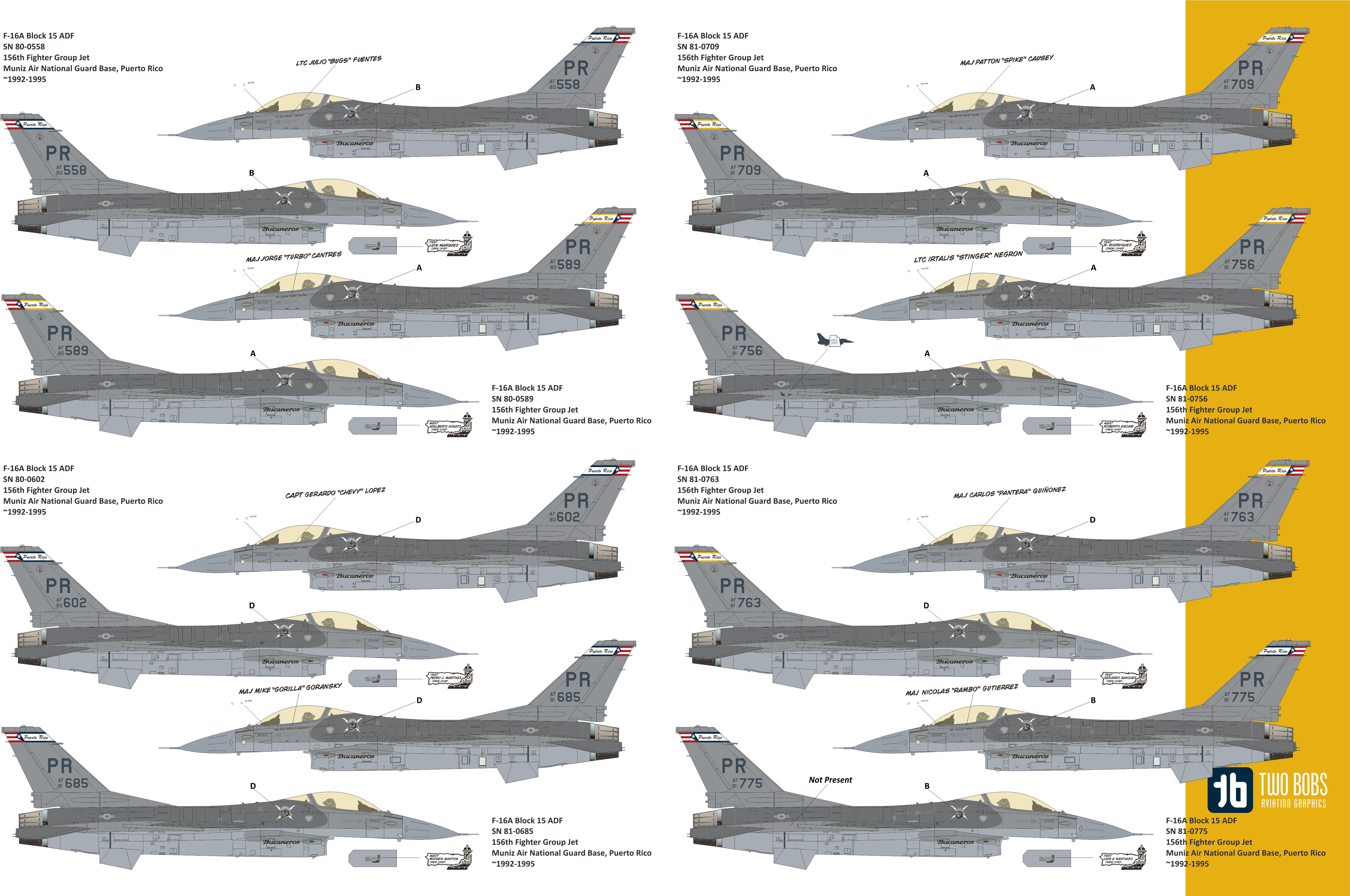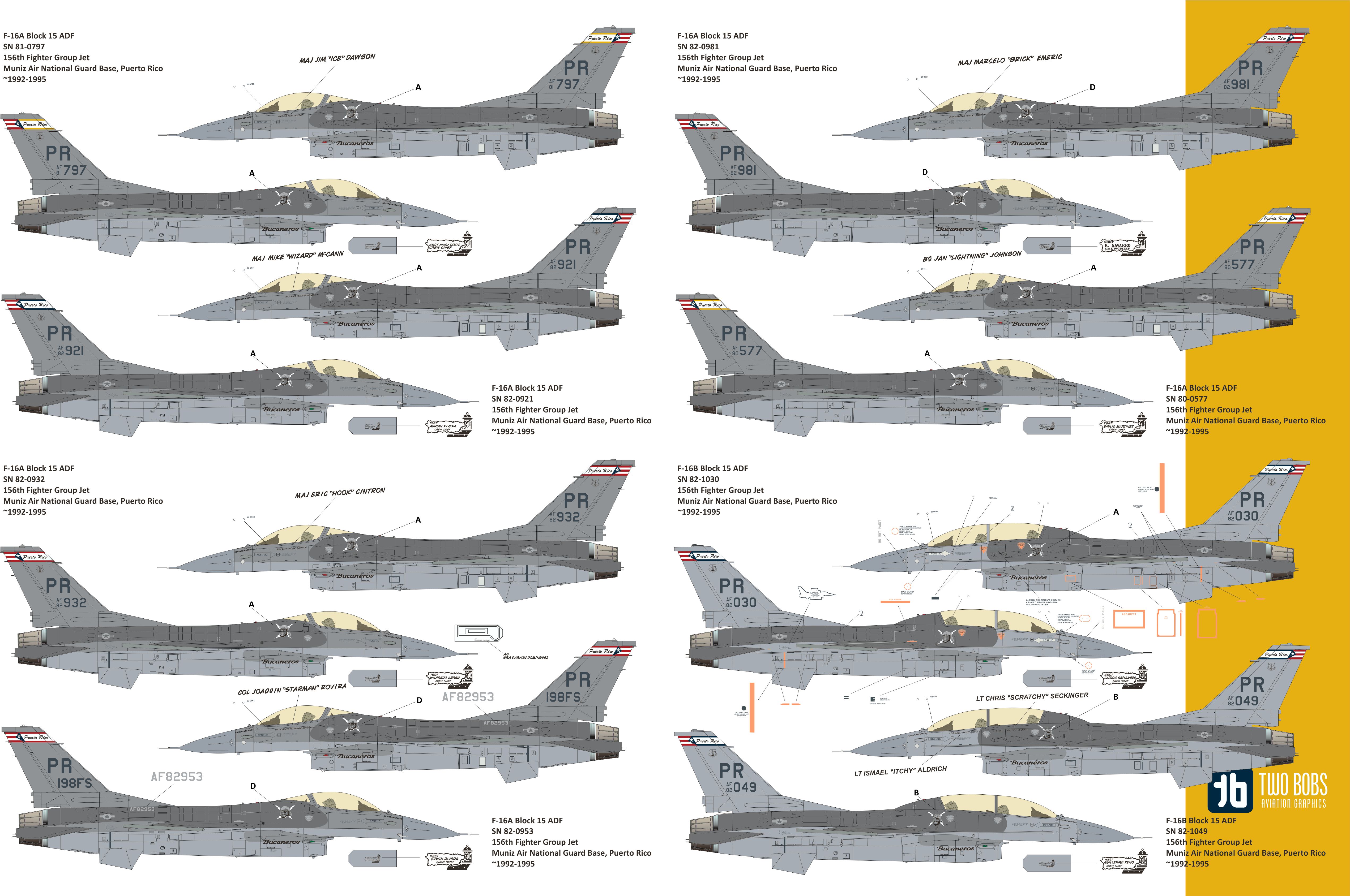 Two Bobs - 1/48 General-Dynamics F-16A/F-16B Vipers of the Caribbean. The most comprehensive sheet ever produced for the Puerto Rico Ang of the F-16. This is the Adf version and will go great with the newly released Kinetic kit which has all the parts required to build this version.