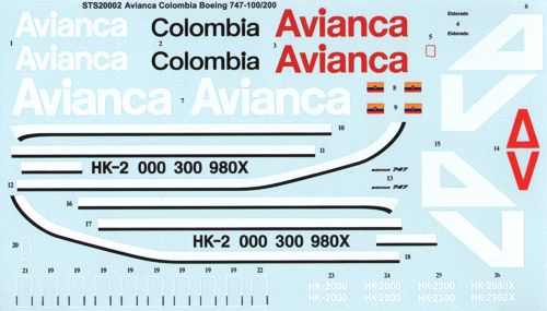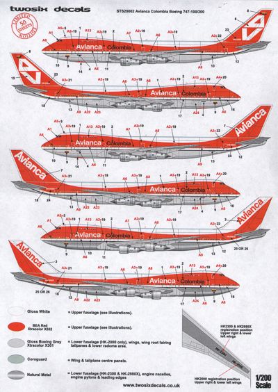 Twosix Silk - 1/200 Boeing 747-100/747-200 Avianca Columbia HK-2000, HK-2300, HK-2980X inc three styles of fin markings.