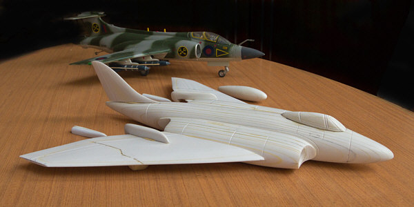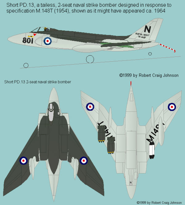Unicraft - 1/72 Shorts PD.13 British 1950 two-seat, carrier-based attack bomber. In the early 1950s, the British Admiralty issued Naval Air Staff Target NAST 39, which laid out the service's requirements for a two-seat, carrier-based attack bomber for service at the end of the decade. This requirement was met, in 1955, by the brilliantly conceived and executed Blackburn/Hawker-Siddeley Buccaneer. But the Buccaneer was not the only response to the Navy's call. Nor was it the most innovative, despite its many advanced features. That distinction goes to one of the proposals that went unfunded, Short's radical, tailless PD.13. In keeping with the orthodoxies of the time, NAST 39 called for an aircraft optimized for low-level, high-subsonic, tactical nuclear strikes using a 1-kiloton nuclear bomb. This device would be delivered using a high-speed toss maneuver. At a point chosen by computer, the aircraft would pitch up sharply to lob the bomb towards the target and then follow up with an Immelman and a low-level escape. But NAST 39 also required a secondary, conventional attack and reconaissance capability. Both needs had to be met by a long-ranging aircraft that could operate from the comparatively small British carriers of the time. In 1952, the Ministry of Supply regularized NAST 39 as specification M.146T Short Brothers and Harland became invoved with M.146T at the instigation of the firm's chief test pilot, Tom Brooke-Smith. Brooke-Smith pointed out that the firm's ongoing research into improving the handling of high-speed wing shapes at low speeds and altitudes might give the firm considerable advantages in the M.146T contest, given the awkward combination of high weights, short take-off and landing distances, and high-speed, low gust-response aerodynamics that the specification demanded. This research was an extension of the work of Professor G.T.R Hill, the well-known proponent of tailless flight and the developer of the Pterodactyl aircraft of the 1930s. In the post-war years, Hill became interested int the handling problems that plagued the first generation of swept-wing, transonic fighters and research aircraft. He was able to show that, when applied to a swept surface, conventional structural principles let the wing twist in ways that nullified or reversed control inputs, producing instability and loss of control or structural failure. Hill's answer to this problem was twofold: an "aero-isoclinic" wing designed to flex in ways that enhanced stability and controllability and "tip controllers," all-moving wingtips that offered greater control power than conventional ailerons. Hill's ideas seemed to have merit when tested in the Short SB.1 glider and SB.4 Sherpa jet research aircraft. For M.145T, the Short Borthers design team proposed a evolutionary two seater with folding, aero-isoclinic wings, tip controllers, and Rolls-Royce RA.19 engines fitted with jet deflection. The the twin-wheeled nose landing gear retracted aft into the uselage, while the single-wheel main struts swung aft into streamlined blisters on the trailing edge of th sharply swept wing.The crew cabin recalled that of the DeHavilland Sea Vixen. The pilot sat under a fighter-type bubble canopy to port, while the navigator sat beneath a flush-mounted hatch to his right The PD.13 offered too many advanced features to be successful, in fact. These innovations introduced clear risks without offering equally clear advantages. Tailless aircraft had a largely disastrous record at the time (witness the Dh.113). Jet deflection was a complete unknown that might cause all sorts of fatigue, deck handling, and stability problems. The tip controllers, though arguably advantageous for a high-altitude fighter, offered no real advantages in a strike airplane operating at sea level. , There were (and still are) doubts about the real efficacy of aero-isoclinic wing design, particularly since more conventional solutions (such as inboard ailerons slab tailplanes) were by now well-proven. Given the success of the less-radical but still very advanced Buccaneer, all this was enough to doom Shorts efforts.